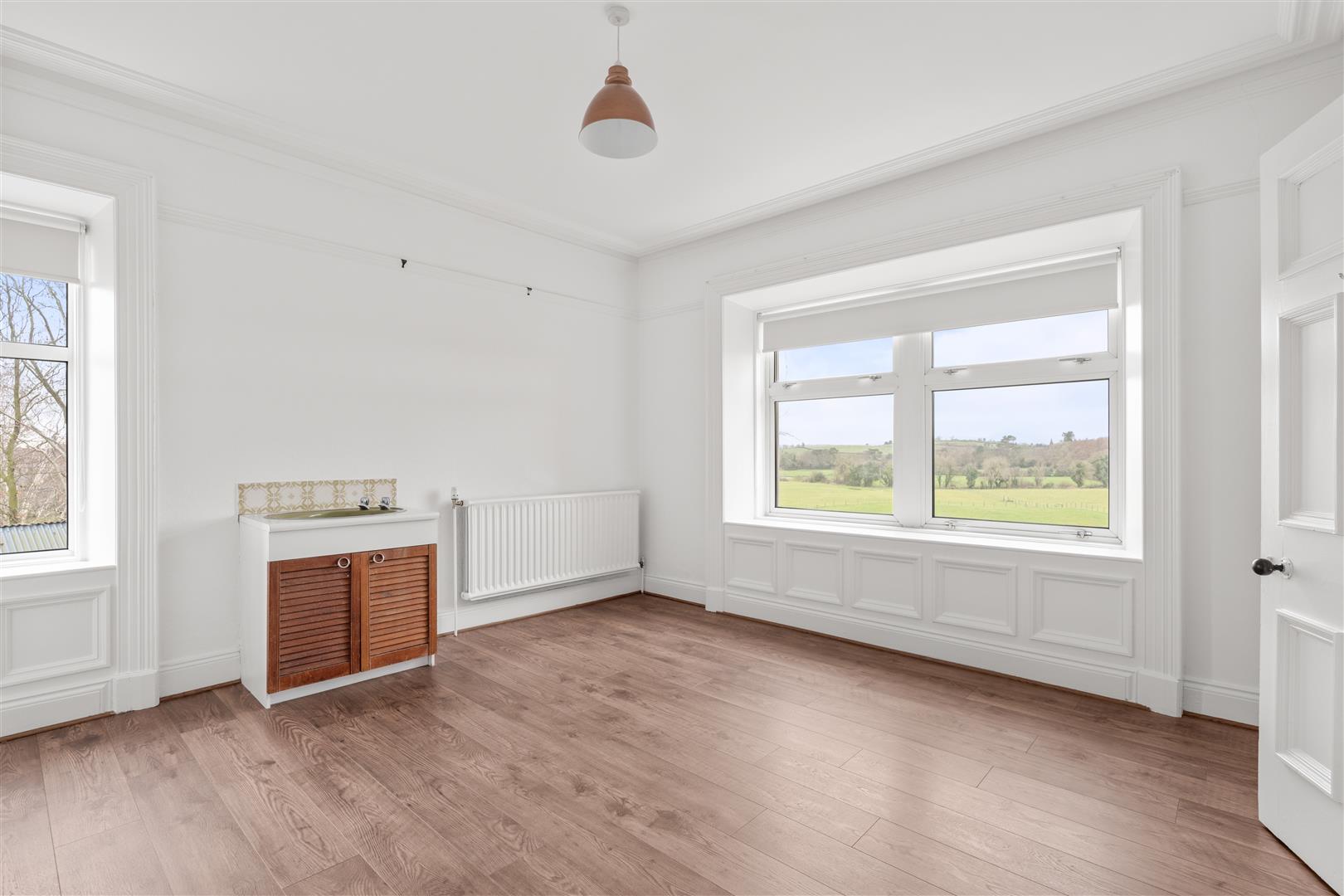 Vanity unit with fitted wash hand basin with cupboards under; wood laminate floor; corniced ceiling;