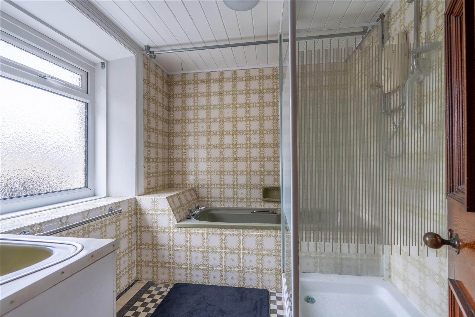 Coloured suite comprising panelled bath; tiled shower cubicle with Dimplex electric shower; etched glass shower door and side panels; vanity unit with wash hand basin and cupboards; tiled walls; extractor fan;