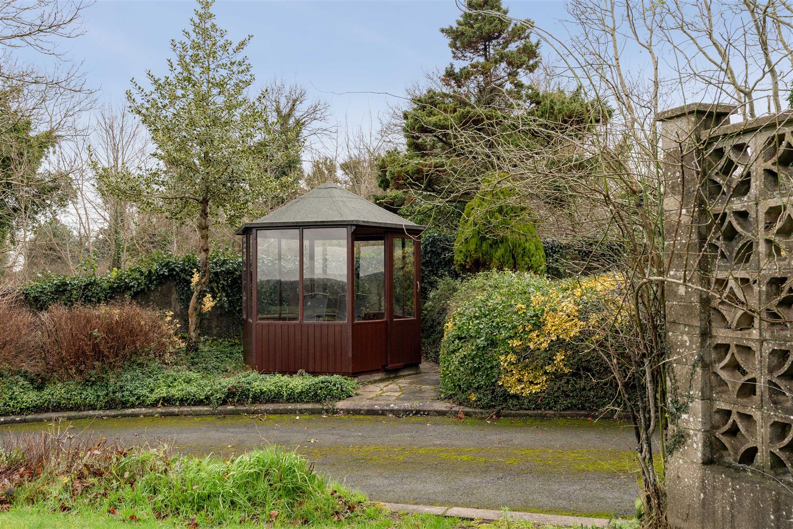 Spacious gardens to front, side and rear laid out in lawns and planted with ornamental shrubs; wooden summer house;