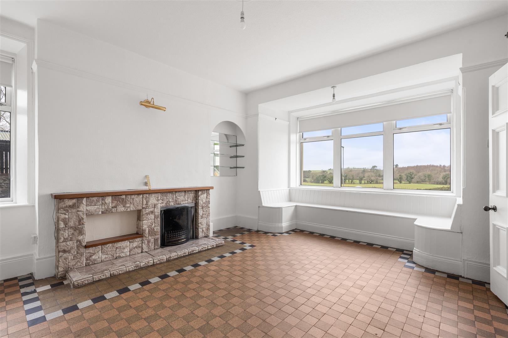 Tiled fireplace and hearth; tiled floor; built-in bench seat;