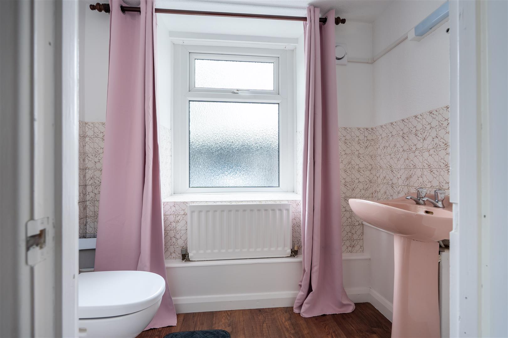 Close coupled wc; pedestal wash hand basin; wood laminate floor; half tiled walls;