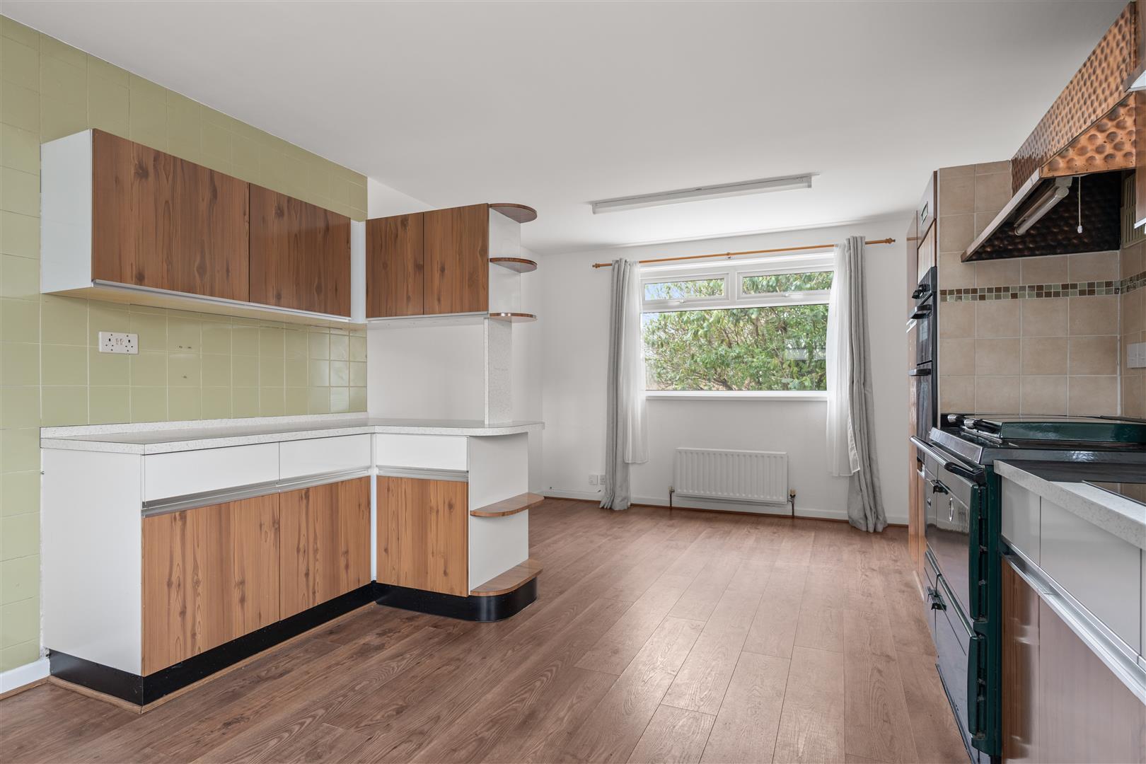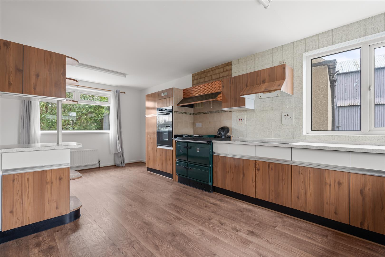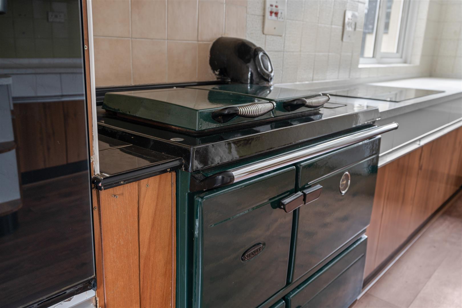 Double drainer stainless steel sink unit with mixer taps; good range of laminate eye and floor level cupboards and drawers; formica worktops; Stanley oil fired range cooker; Smeg dishwasher; Hotpoint double electric ovens; four ring ceramic hob with extractor unit over;