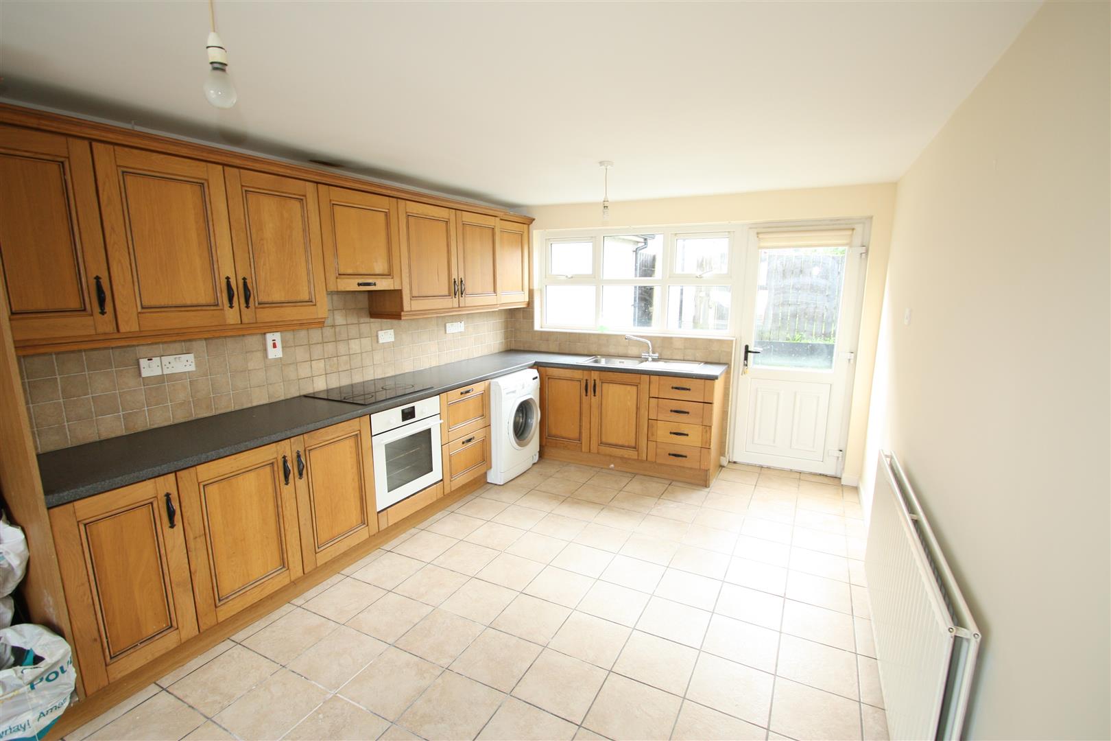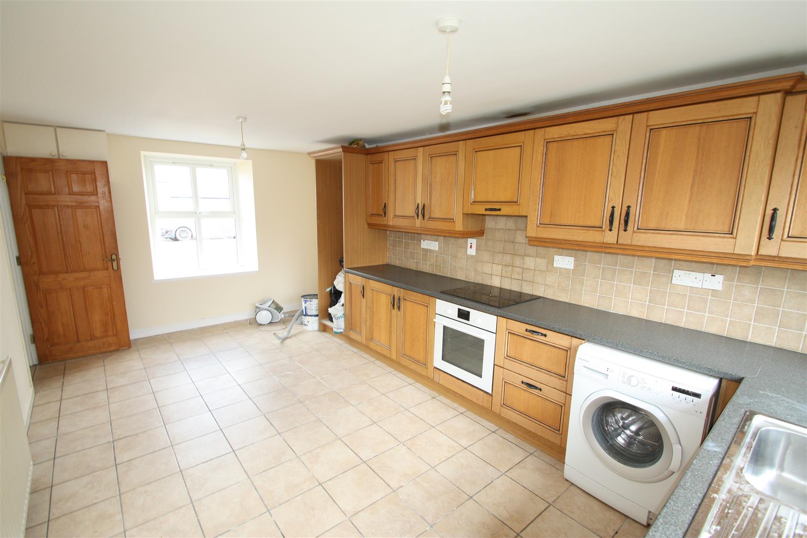 Range of high and low rise units with tiled splash back and stainless steel sink and drainer. Integrated electric oven and hob with extractor fan. Recess for fridge/freezer and washing machine. Tiled floor. Space for dining. Door to rear.