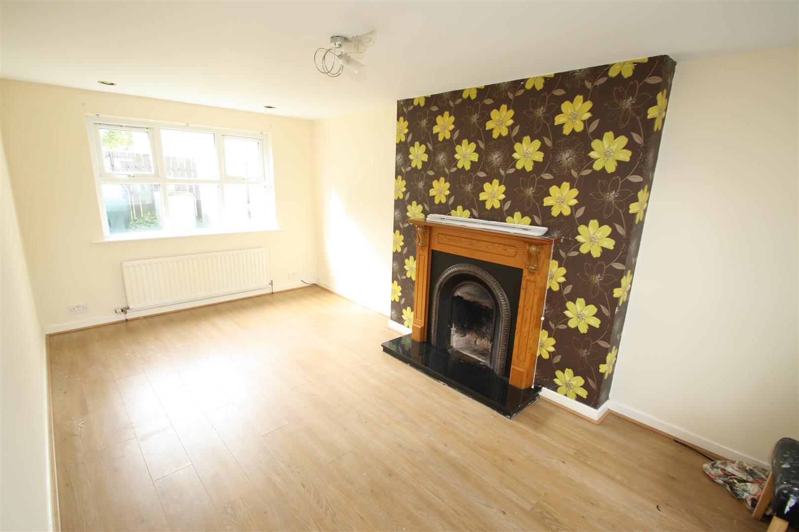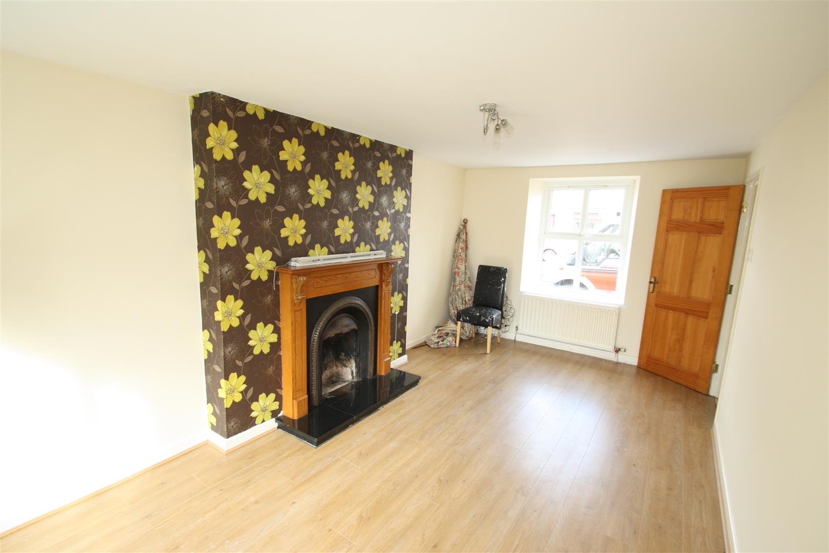 Fireplace with wooden surround and mantle, decorative inset and granite hearth. Wooden laminate flooring.