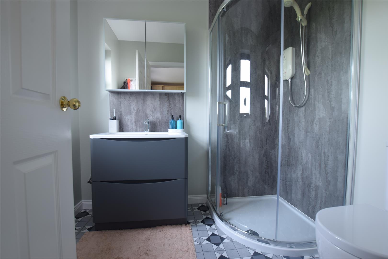 Low flush w.c. vanity unit and corner walk in shower. Window to rear.