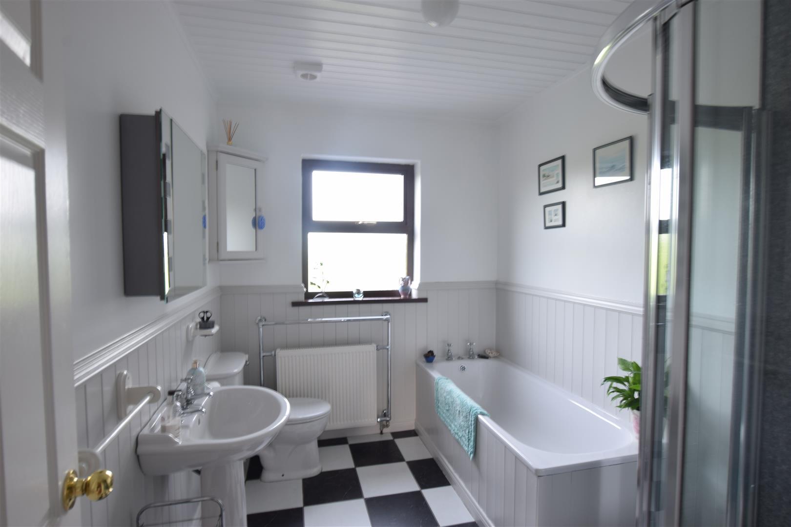 White low flush wc, pedestal wash hand basin, panelled bath, Corner walk in power shower. Tiled flooring. Window to rear, door to: