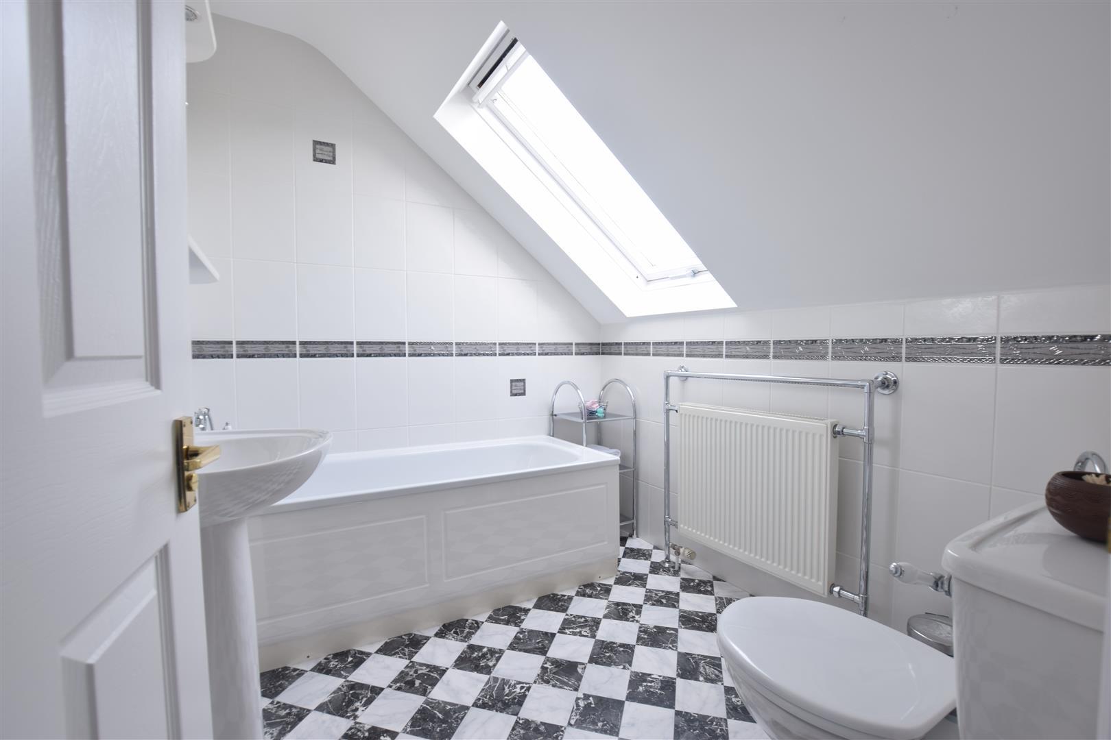 White low flush w.c., pedestal wash hand basin, bath with overhead shower. Skylight, door to: