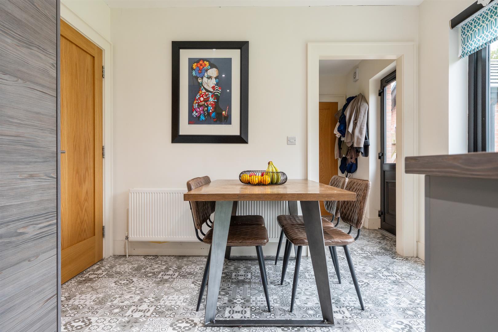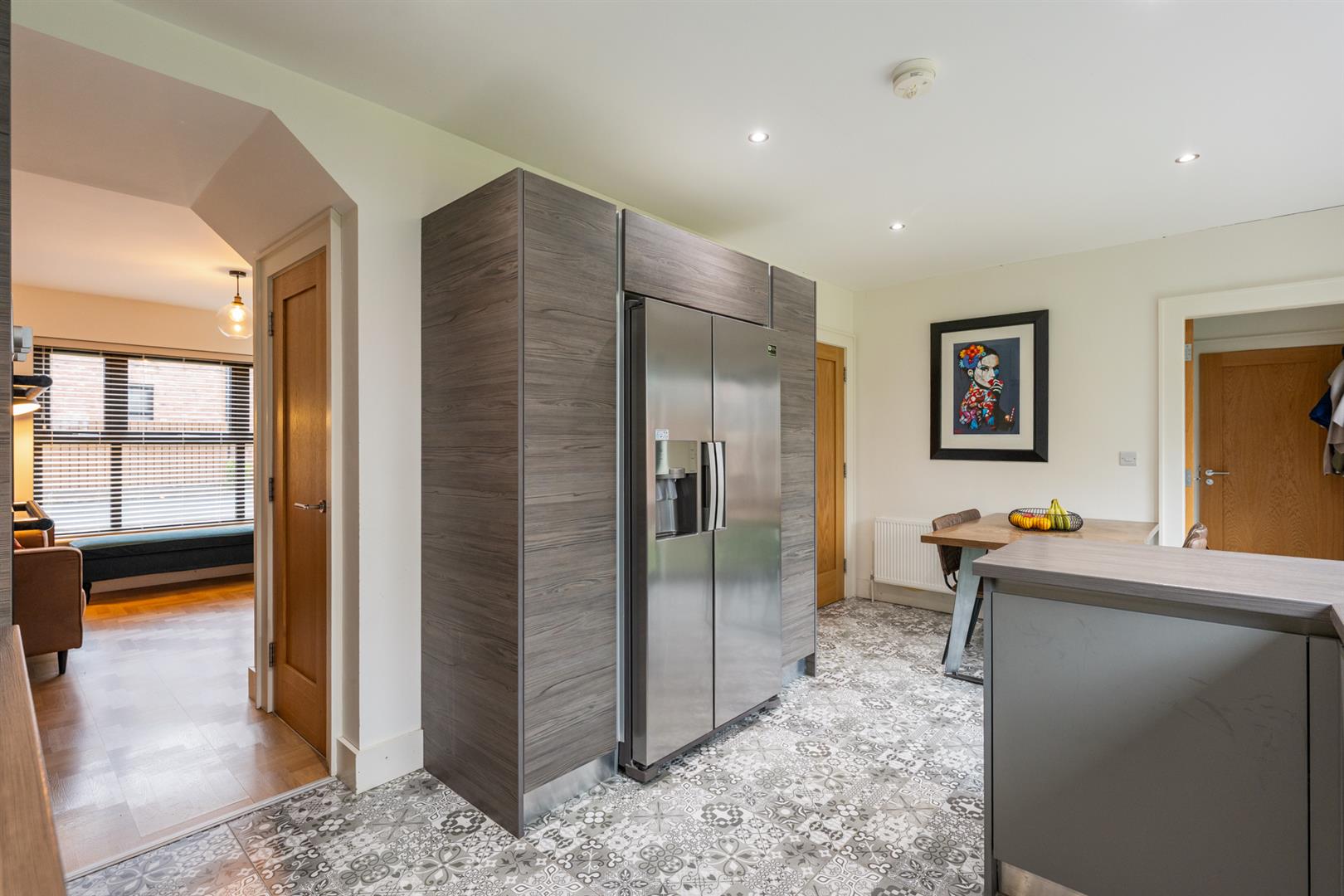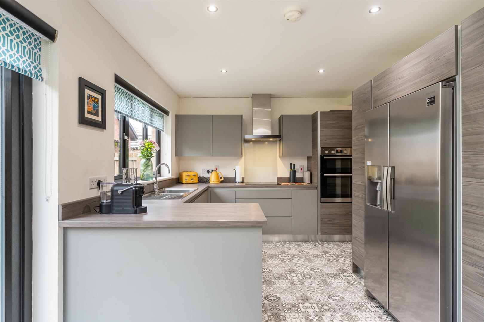 Contemporary High and low level units with hob and eye level double oven. 1 1/2 stainless steel sink unit. Stainless steel extractor fan. Recess for American style fridge freezer. Tiled floor. Window to rear, double door, door to: