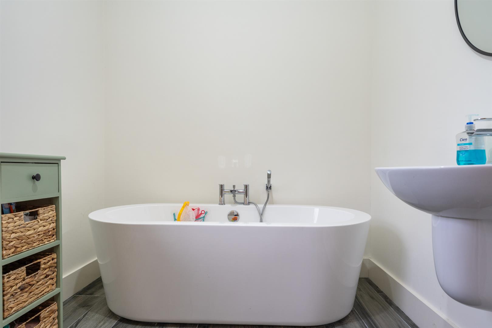 White freestanding bath, shower cubicle with wall shower, low flush w.c, pedestal wash hand basin. Tiled floor. Window to rear, door to: