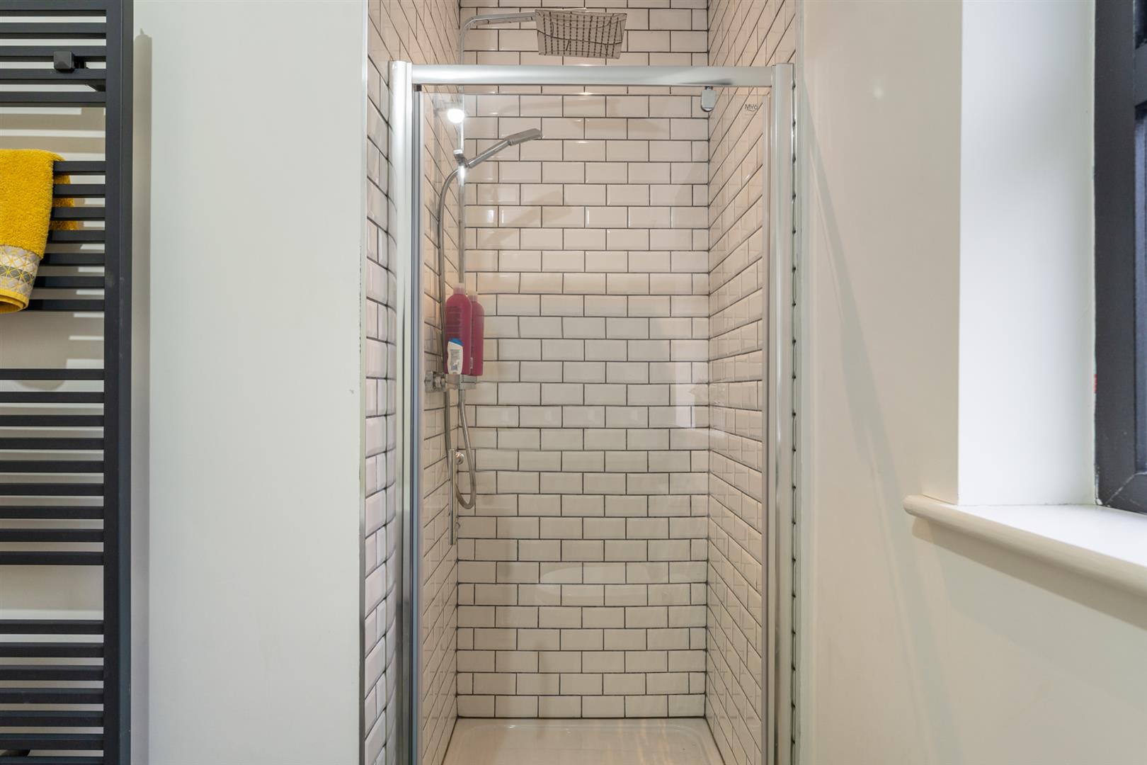 White low flush w.c. vanity unit, Shower cubicle with wall shower. Tiled floor. Window to front, door to:
