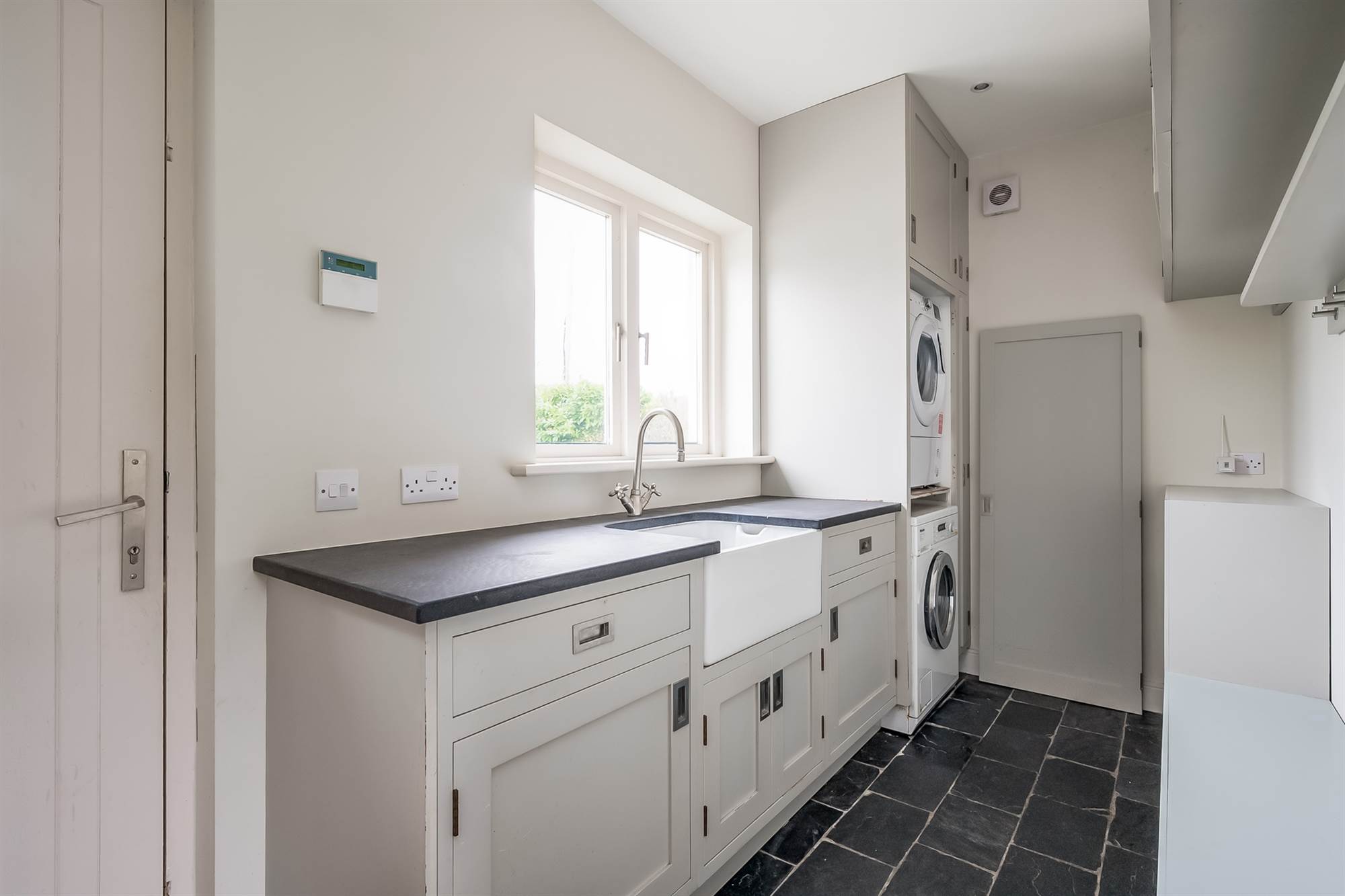 (at widest points). Units, work surfaces, old Belfast style sink, plumbed for washing machine, space for tumble dryer, cloaks area, ceramic tiled floor, low voltage spotlights, door to front.