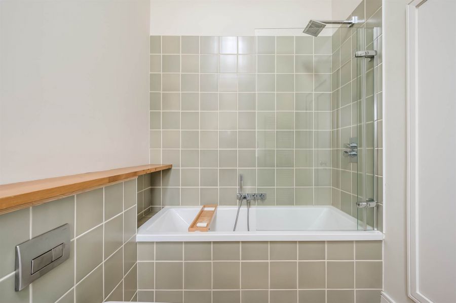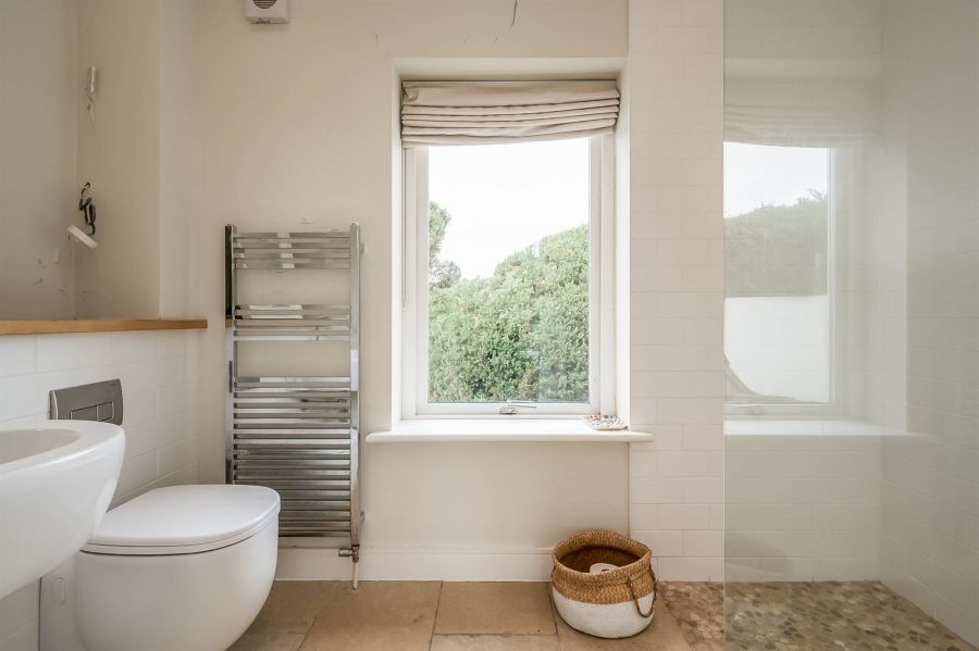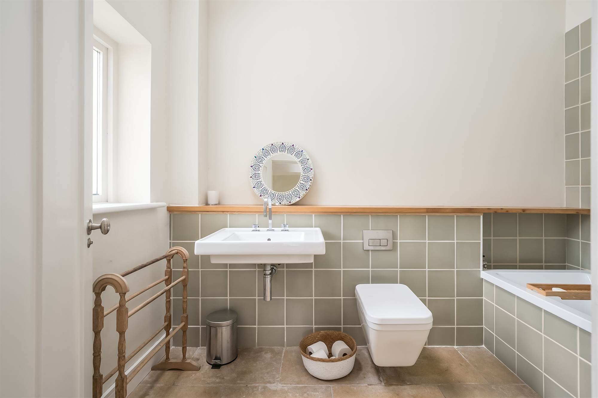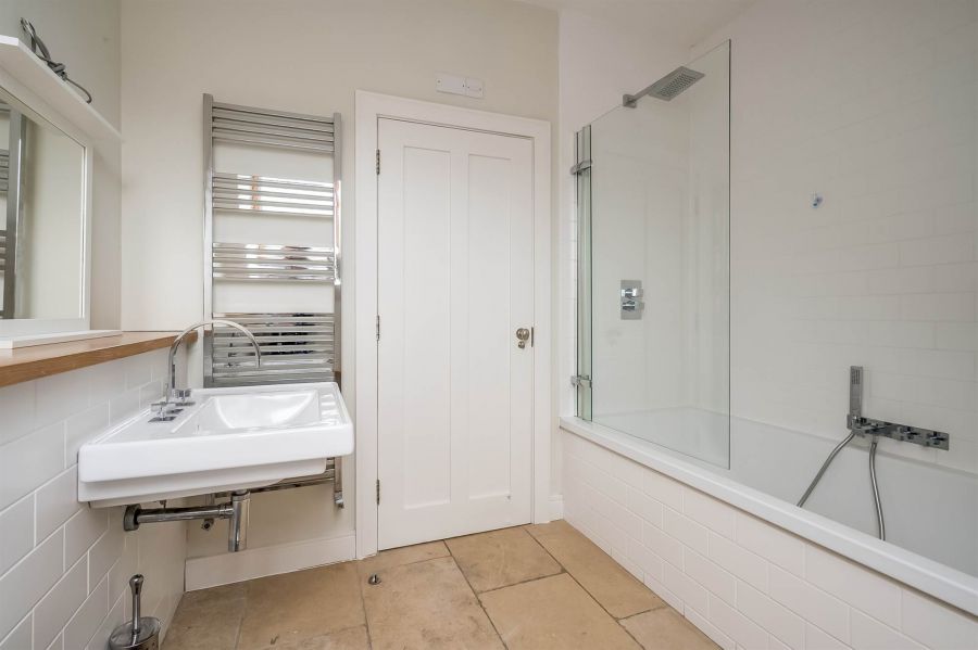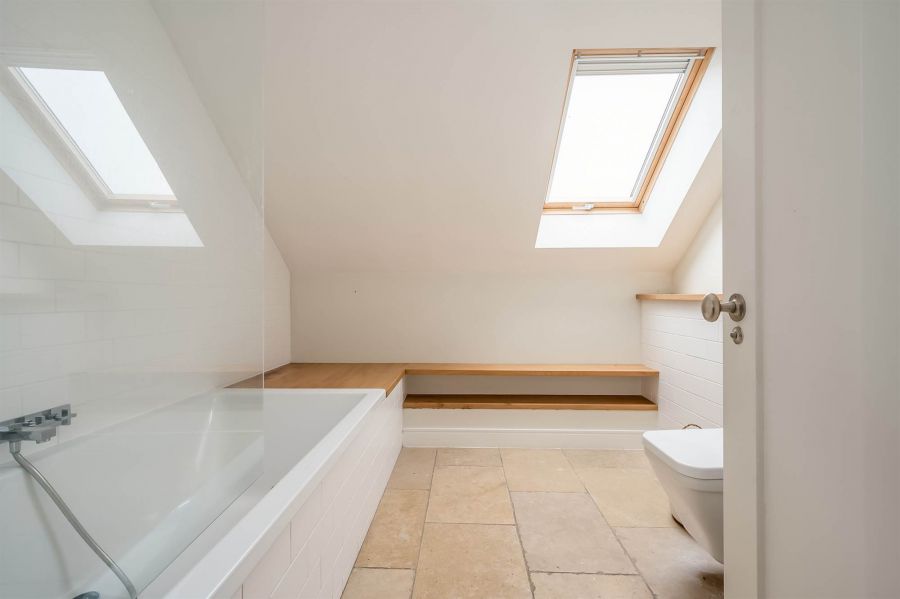 White suite comprising low flush wc, wash hand basin, panelled bath with shower over, part tiled walls, wooden shelving, ceramic tiled floor, heated towel rail, Velux window, low voltage spotlights, extractor fan.