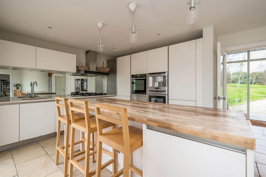 (at widest points). Range of high and low level units, marble work surfaces, sink and drainer, Miele five ring gas hob with extractor fan over, pull-down larder cupboard, integrated double ovens, warming drawers, coffee machine, pantry cupboard, American fridge freezer, integrated dishwasher, large island/breakfast bar with units and wooden work surface, mirror splash back, tiled floor, low voltage spotlights, glazed doors to patio. Double doors to . . .