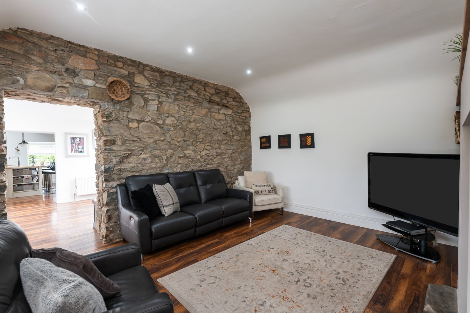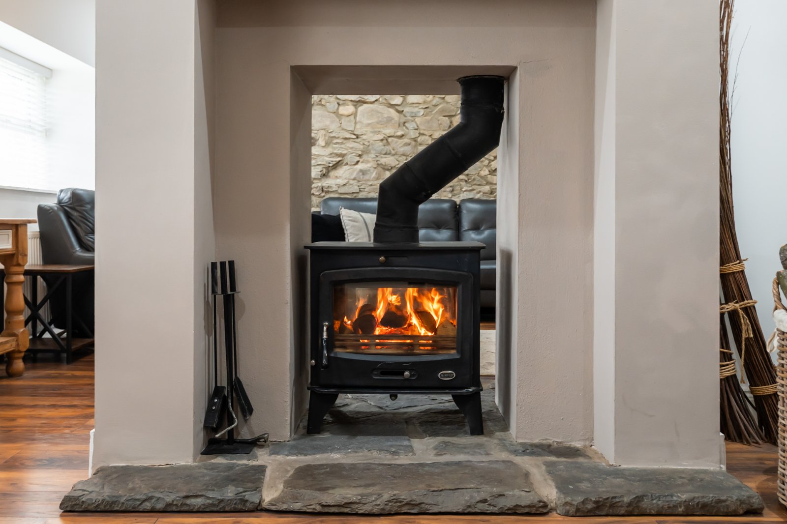 Feature stone wall; industrial laminated flooring; TV aerial connections; double sided hole in the wall fireplace with heritage enclosed cast iron stove on stone flagged hearth.