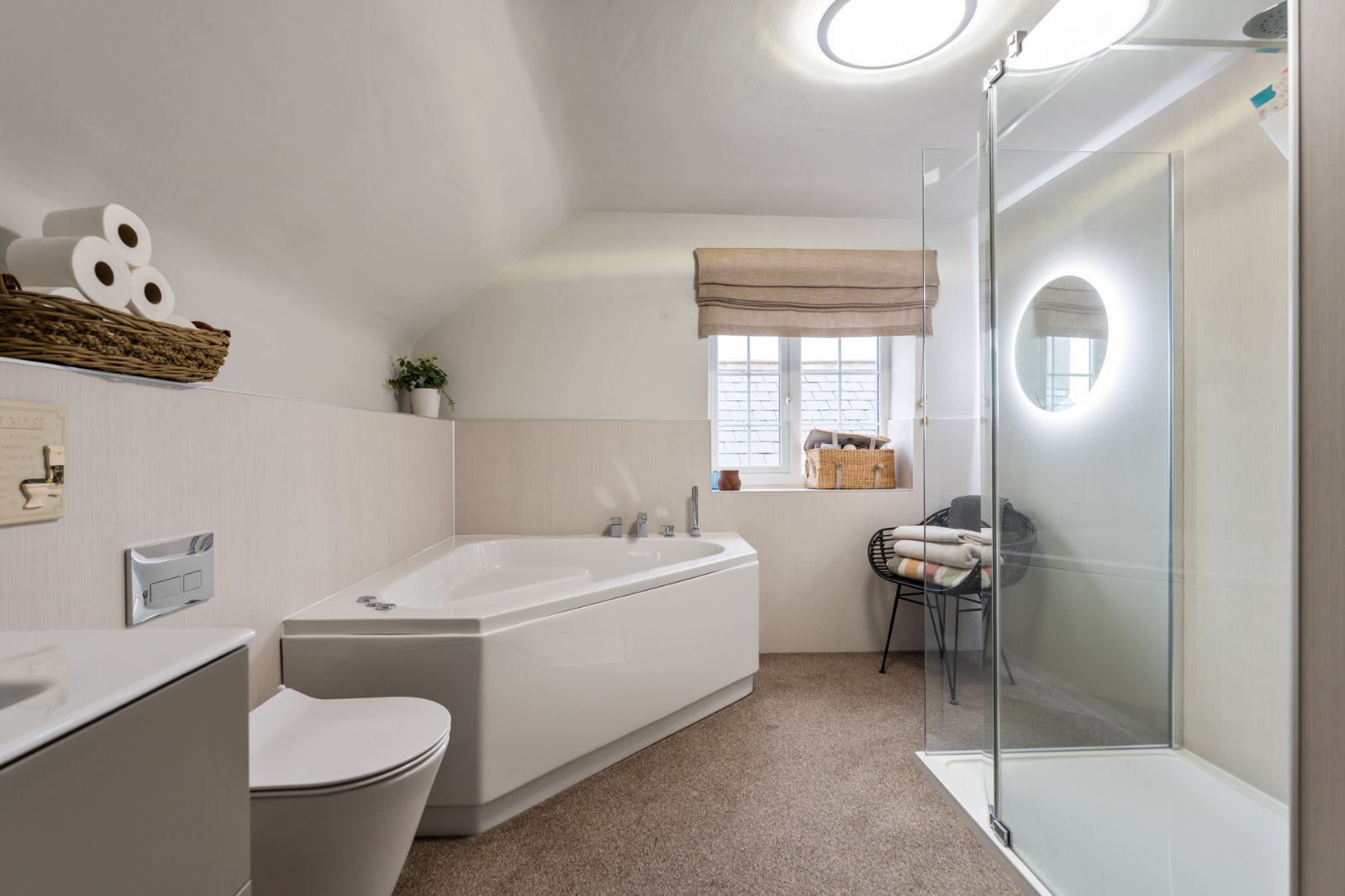 Contemporary white suite comprising of wall mounted WC; jacuzzi panelled bath with chrome mixer taps; pull out shower head; vanity unit with fitted wash hand basin and chrome mixer tap; panelled shower cubicle with thermal controlled shower; glass shower door and side panels.