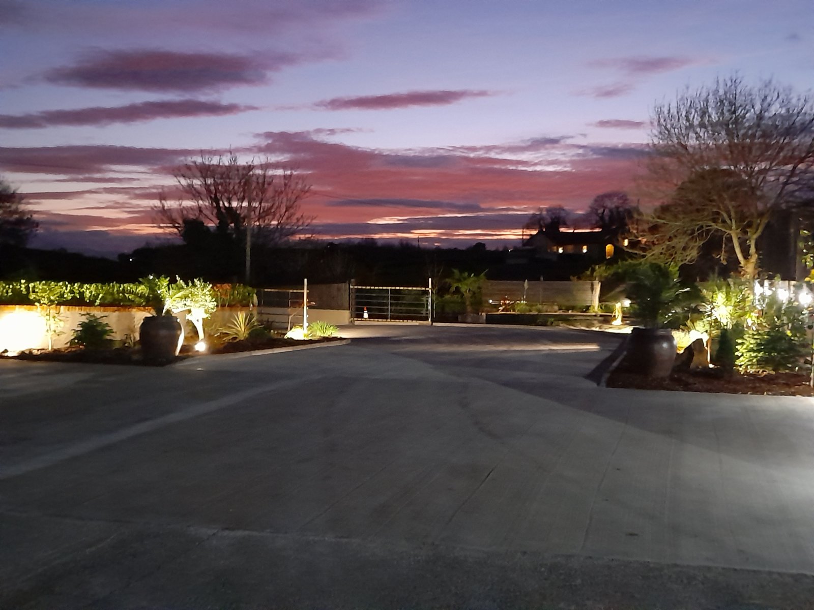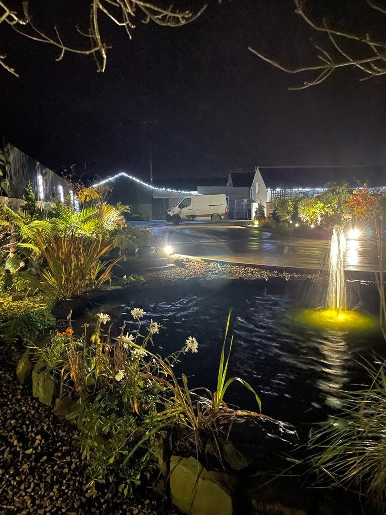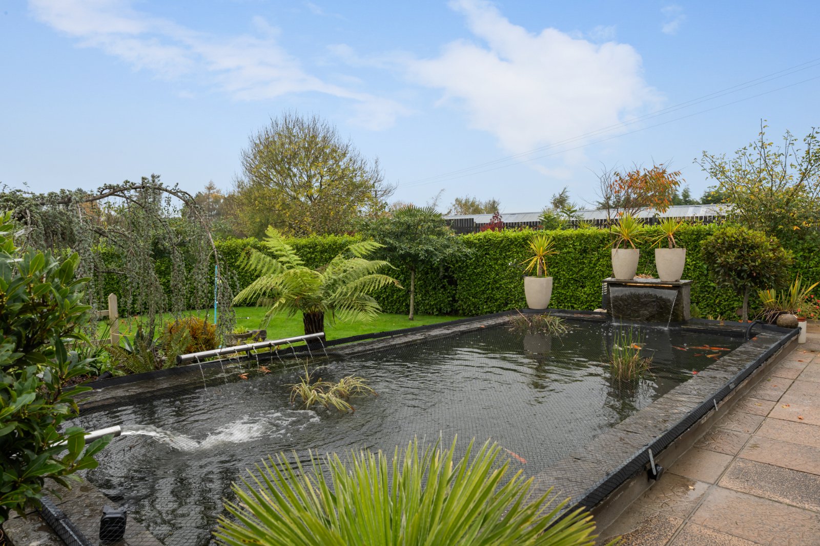 Electric gates to spacious concreted drive leading to yard providing ample parking. Delightful gardens to front with range of flagged and old brick terrace overlooking lawns enclosed with walls: Feature illuminated gravelled pond with random stone water fountain and central flagged patio, illuminated scree beds with raised brick flower bed planted with ornamental shrubs; a feature gravelled garden is set on the opposite side of the drive landscaped with mature planting and additional pond with fountain.