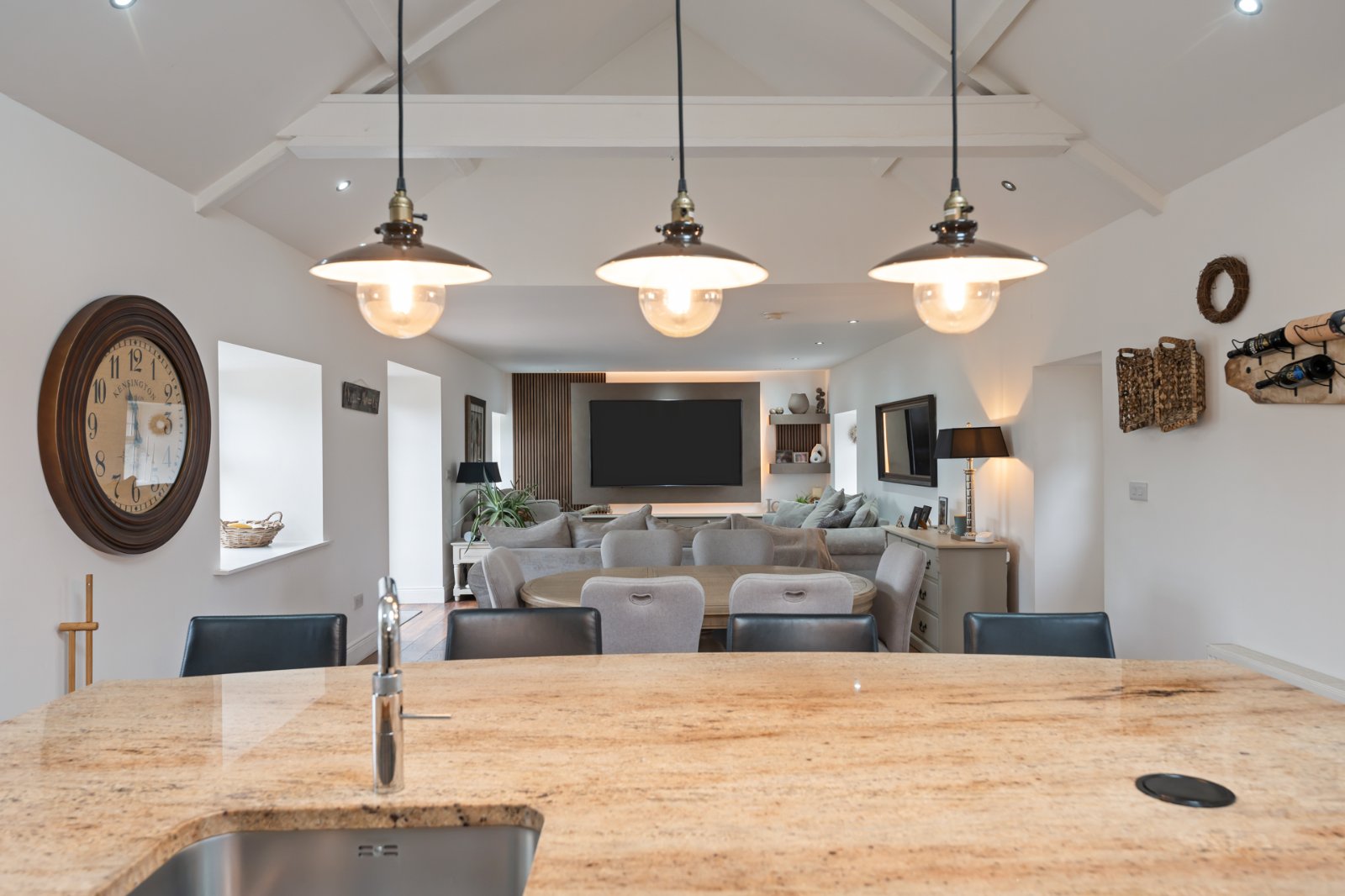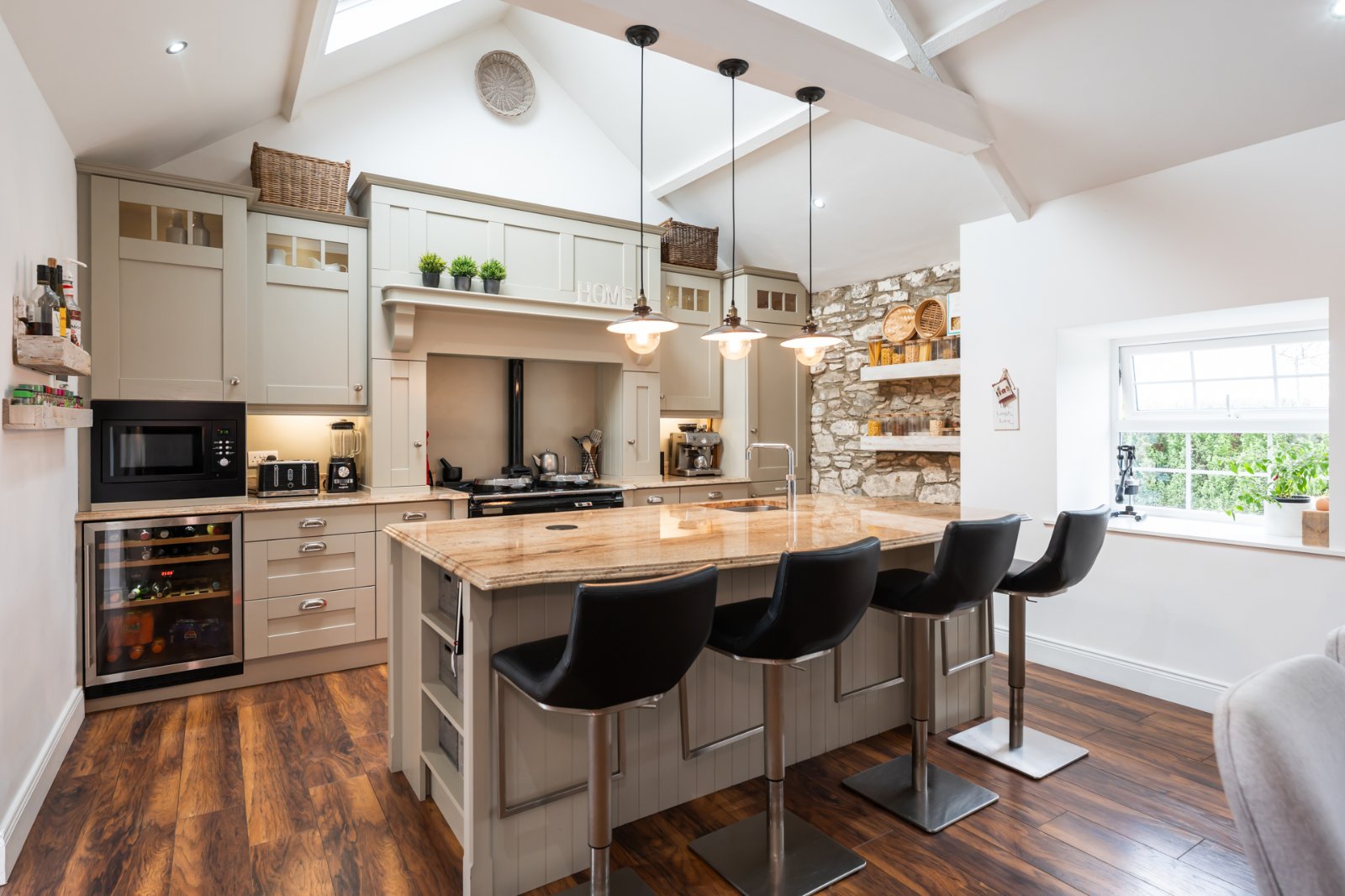 Extensive range of contemporary painted finish eye and floor level cupboards and drawers with illuminated glazed panels; concealed lighting under cupboards; matching island with range of fitted cupboards bookshelves; pull out waste bin and wine rack; integrated Nordmende dishwasher; matching breakfast bar; polished marble worktop with recessed stainless steel sink fitted with chrome Quooker boiling & cold water tap; pop up power sockets; integrated black two oven oil fired AGA; microwave oven; CDA wine fridge and full length fridge; exposed feature A frame beams in pitched ceiling; led lighting; commercial laminated floor; TV aerial connection point; glazed double patio doors to terrace down to rear court yard.