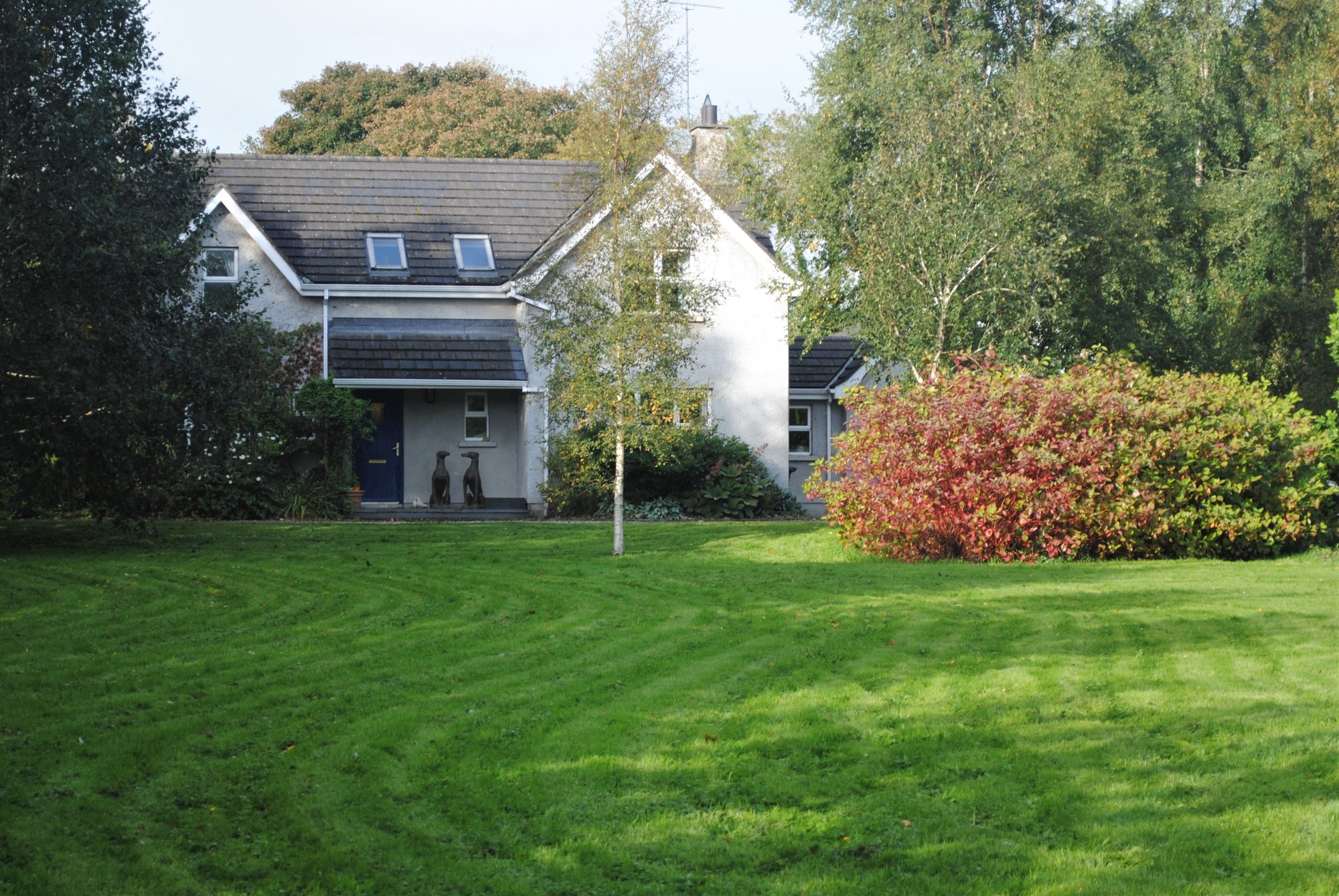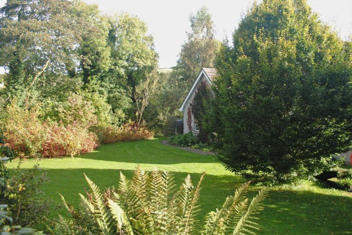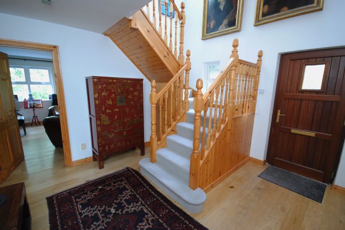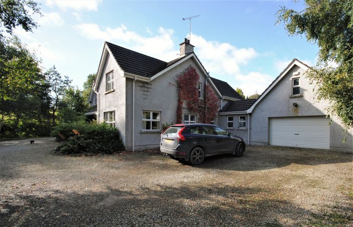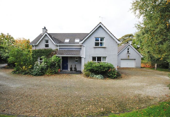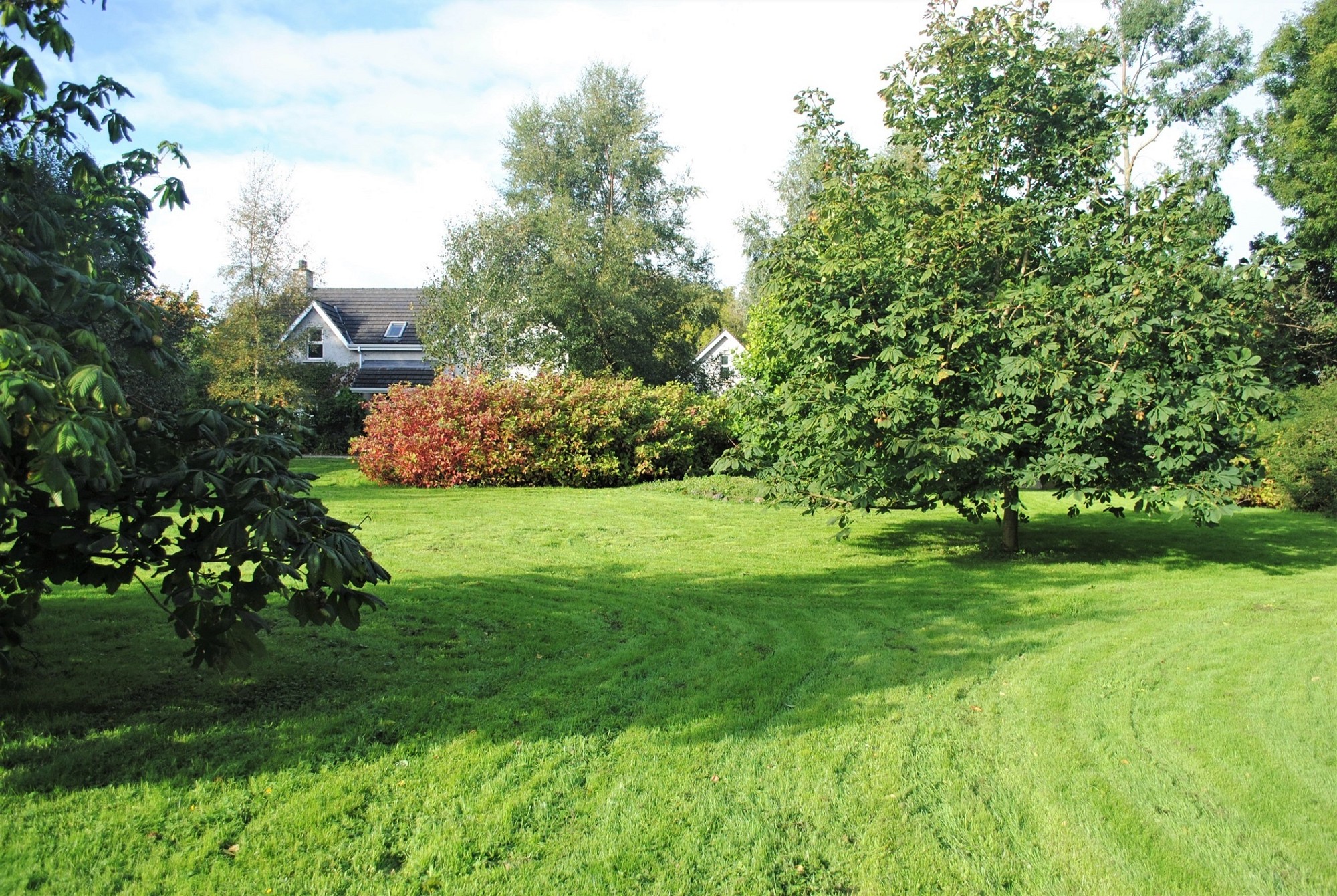 The newly laid tarmac lane leads to a gravelled driveway with parking to the front of the house and adjacent to the integral garage. To the front, the gardens are mainly in lawn surrounded by native trees and dotted with younger specimen trees. To the rear there is a wooden decked area with outdoor lighting leading to a paved terrace with granite steps leading to upper lawn with shrub beds and trees bordered by a stone wall.