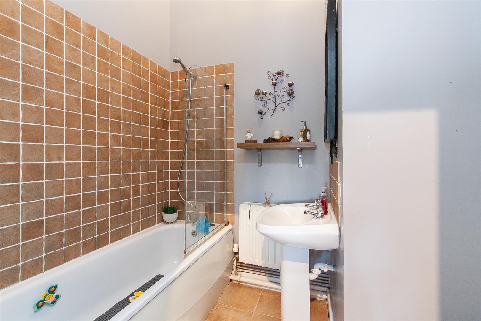 White suite comprising panelled bath, shower screen, thermostatic controlled telephone handset shower, pedestal wash hand basin, low flush wc, partly tiled walls, ceramic tiled floor, extractor fan, double panelled radiator.