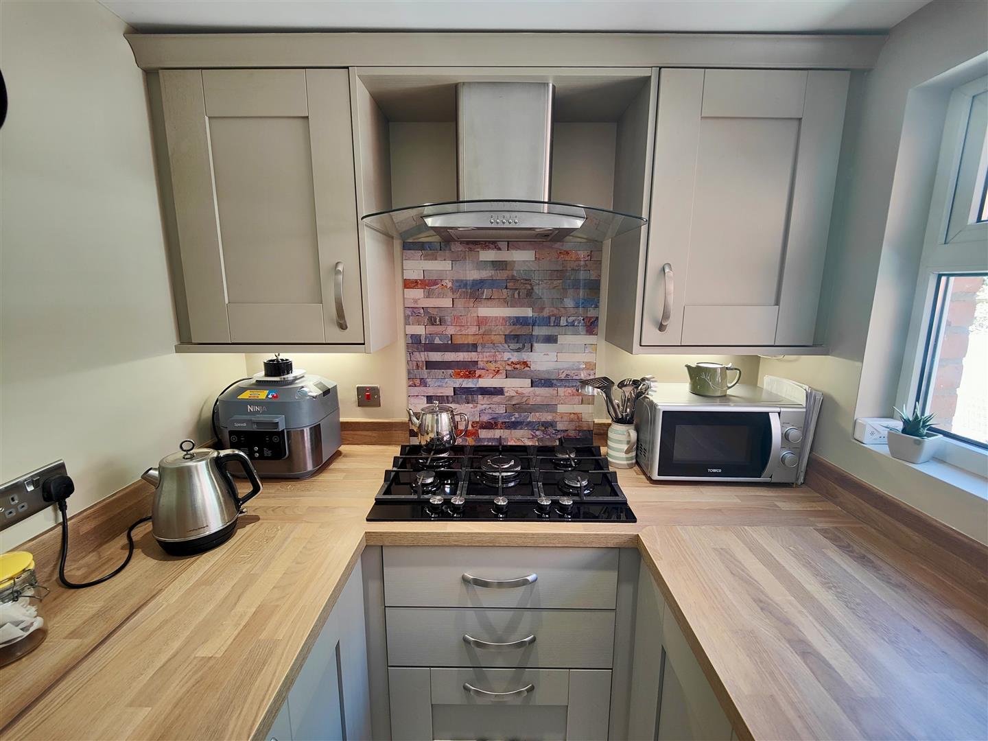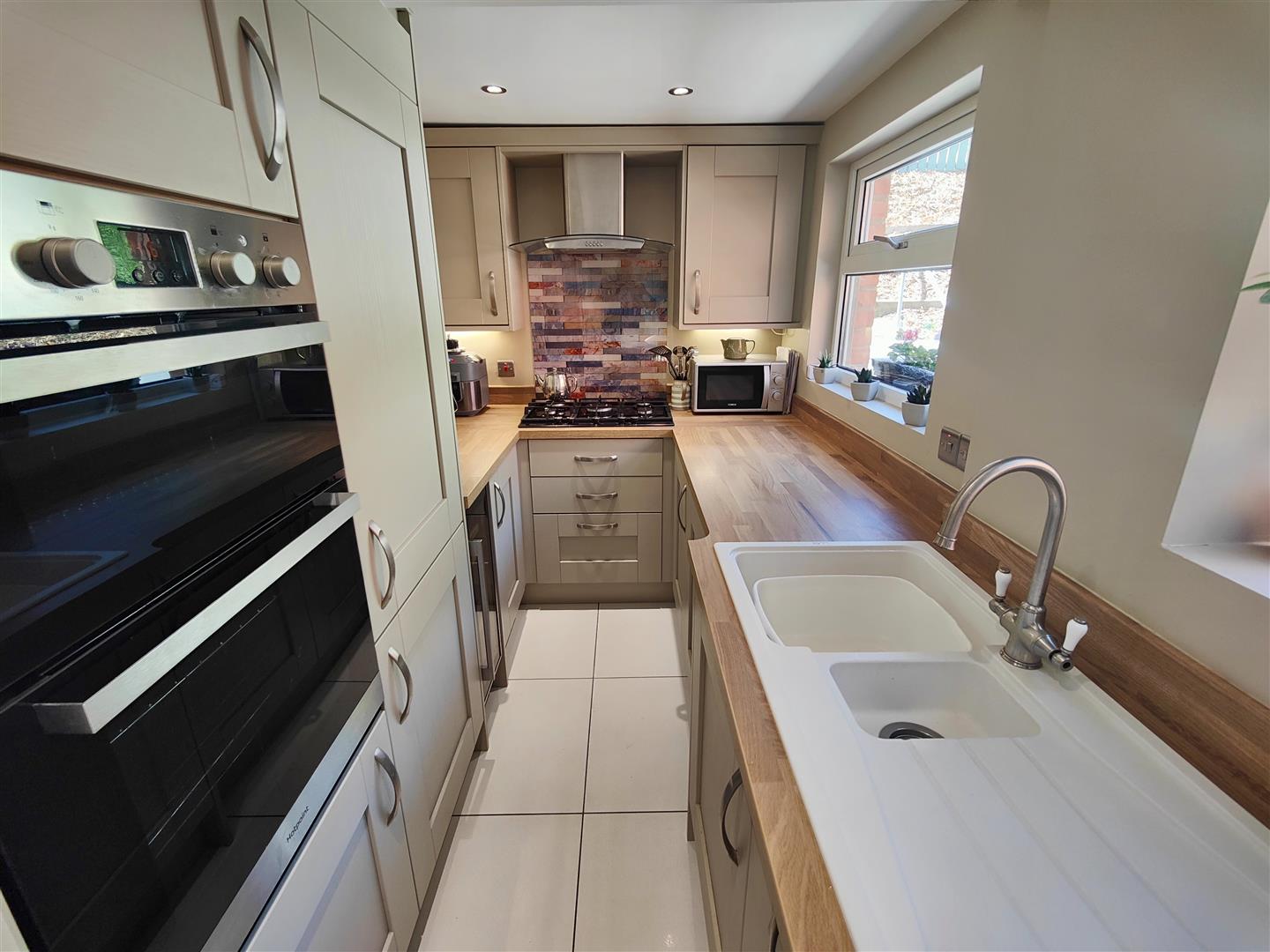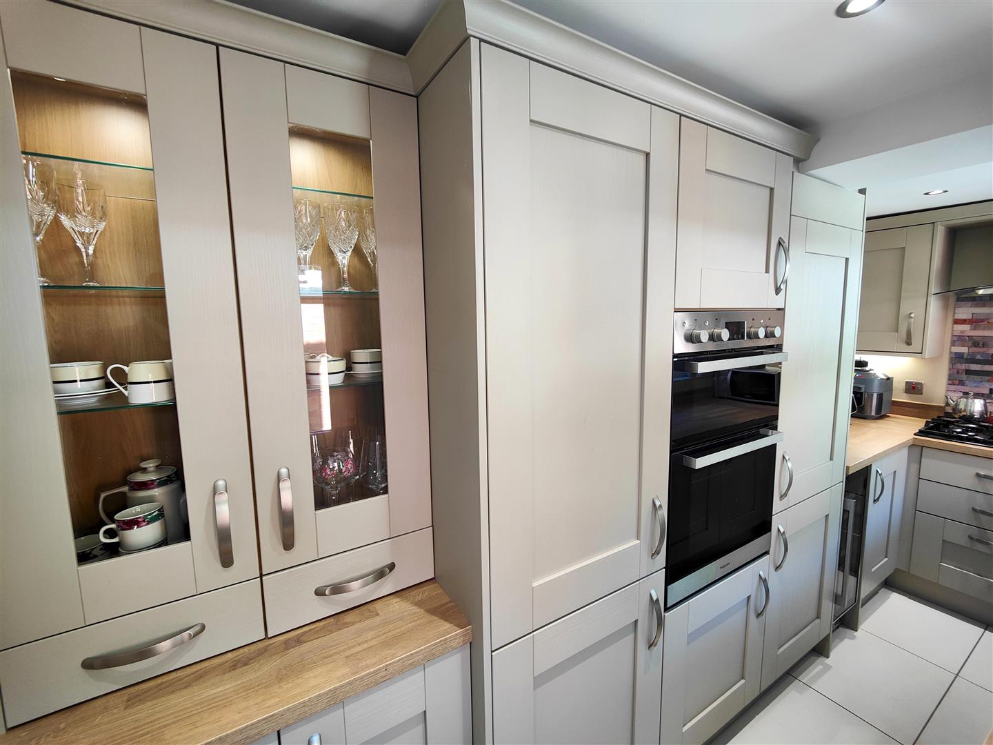 Bowl and 1/2 white sink unit, extensive range of high and low level units, formica worktops, built-in double oven, 5 ring gas hob, stainless steel extractor fan, integrated fridge/freezer, integrated washing machine, integrated dishwater, wine chiller, ceramic tiled floor, recessed light, upvc double glazed door to rear.