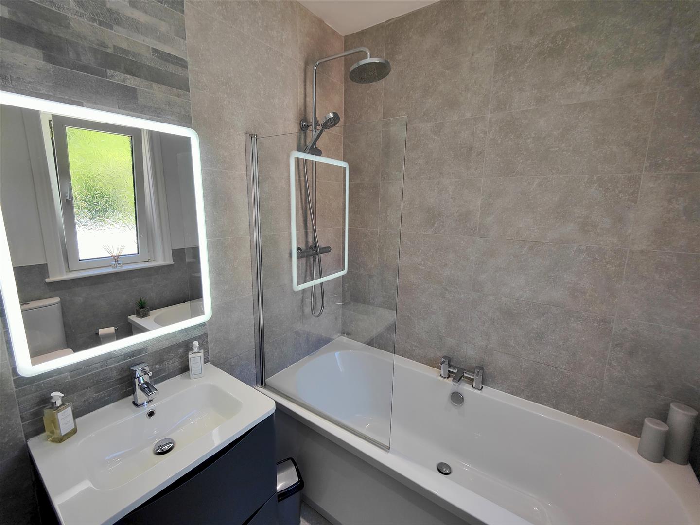 Luxury white bathroom suite comprising panelled bath, drench shower, telephone hand set shower unit, vanity unit, low flush wc, partly tiled walls, ceramic tiled floor, extractor fan, recessed lighting.
