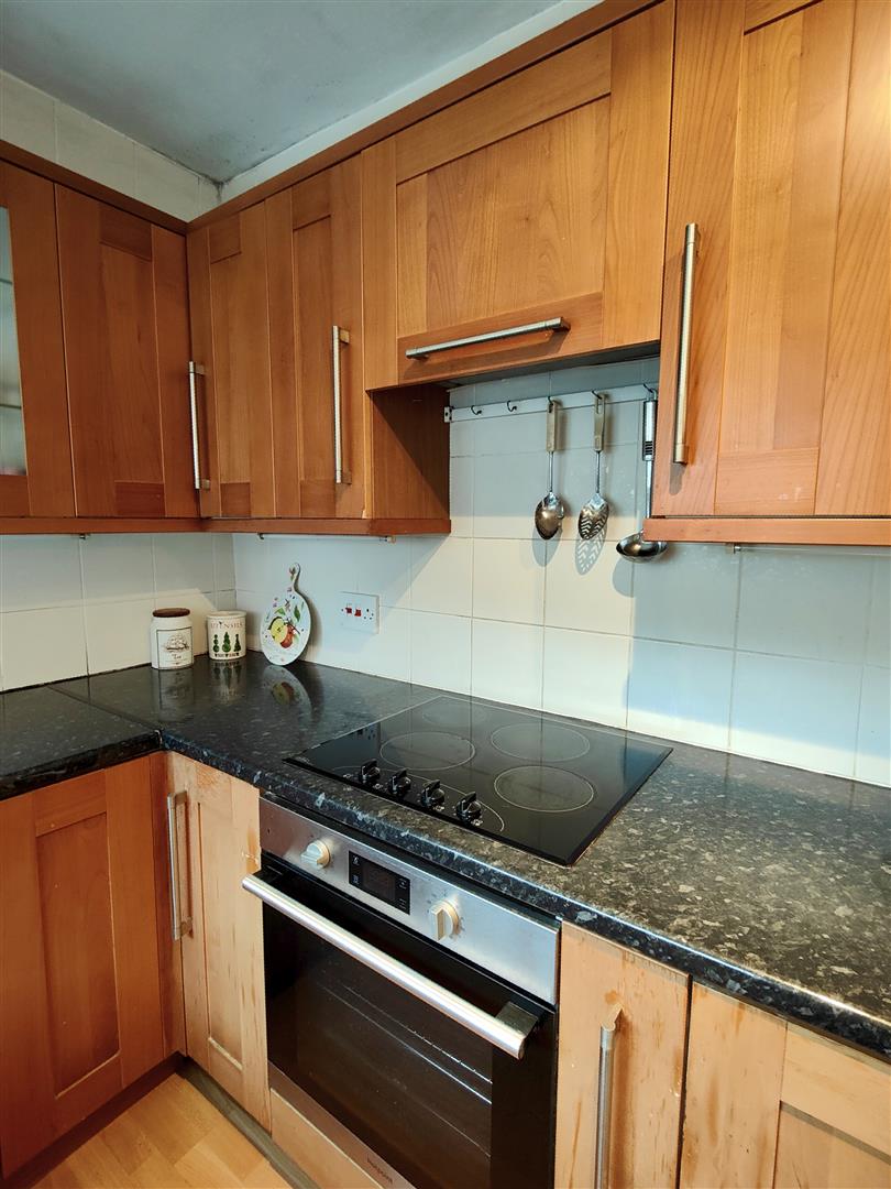 Bowl and a half stainless steel sink unit, range of high and low level units, formica worktops, built-in under oven and ceramic hob, integrated extractor fan, plumbed for washing machine, integrated under fridge and freezer, partly tiled walls, upvc double glazed rear door: