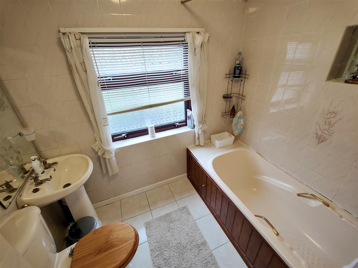 Coloured suite comprising panelled bath, electric shower, pedestal wash hand basin, low flush wc, fully tiled walls, ceramic tiled floor.