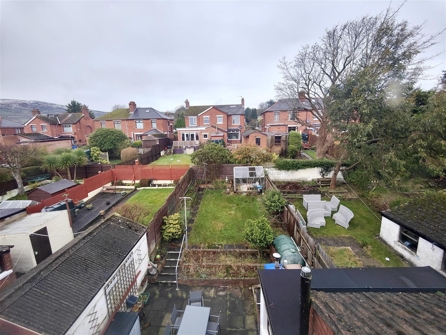 Mature gardens front and rear in lawns shrubs and flower beds, green house, patio area, boiler house, oil tank, outside light and tap.
