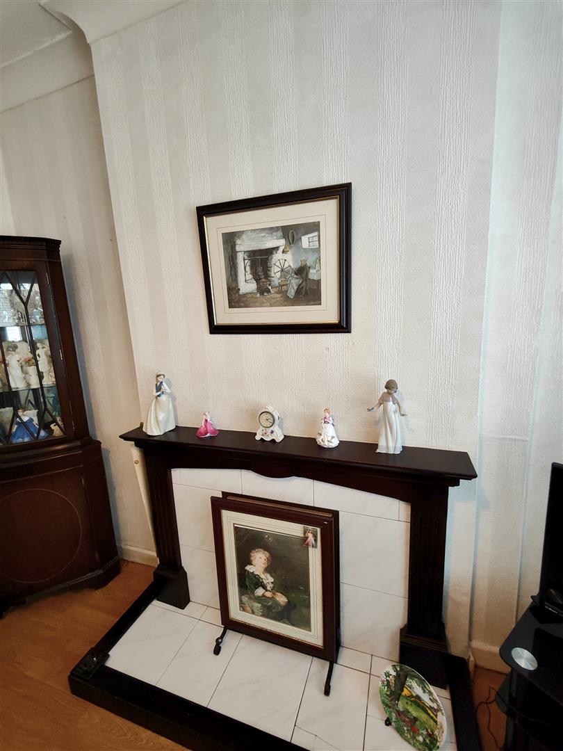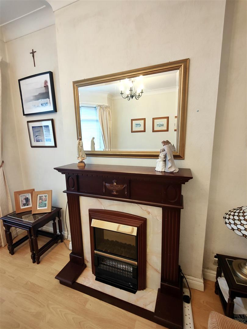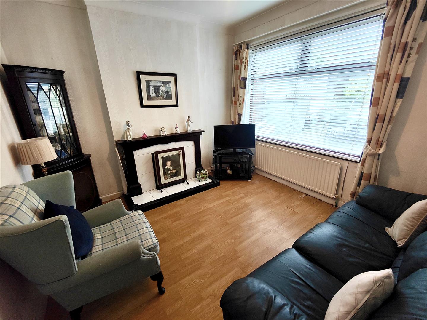 Attractive hardwood fireplace, panelled radiator, wood laminate floor.
