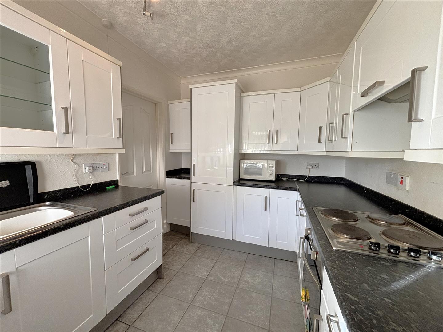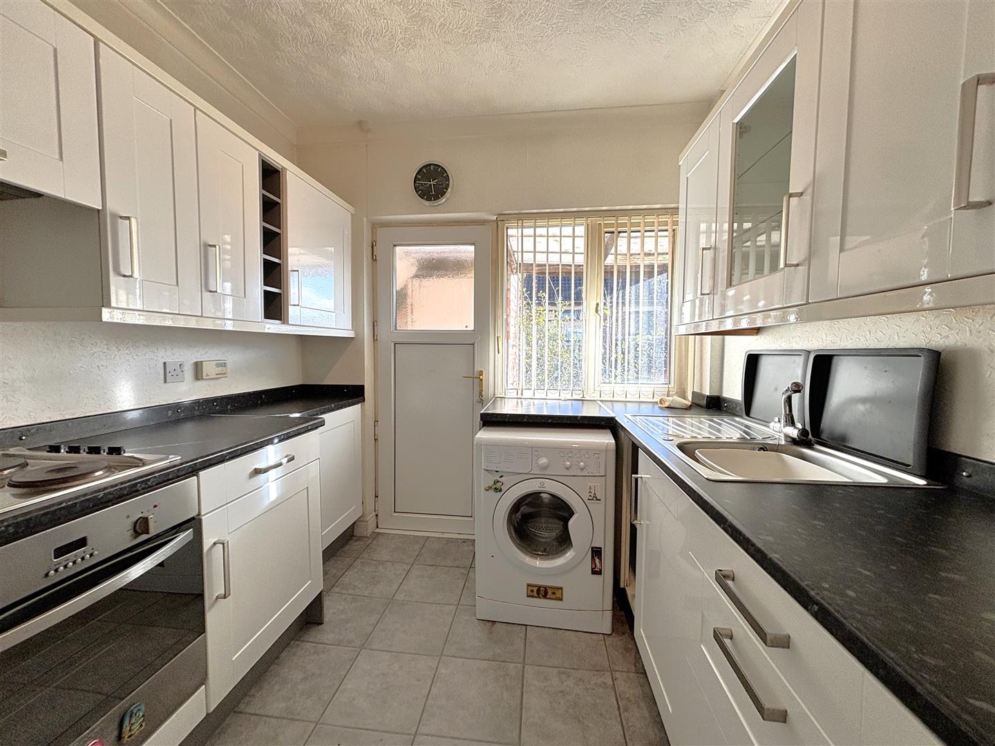 Single drainer stainless steel sink unit, extensive range of high and low units, formica worktops, ceramic hob, built-in under oven, splash back, wine rack, integrated extractor fan, integrated fridge freezer, plumbed for a washing machine, ceramic tiled floor floor, Upvc double glazed rear door.