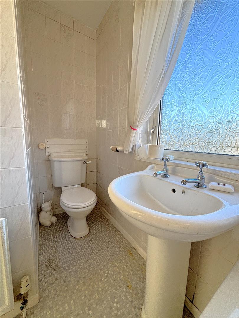 Classic white suite comprising panelled bath, telephone hand shower, pedestal wash hand basin, low flush wc, panelled radiator, fully tiled walls and ceiling, airing cupboard concealed gas boiler.