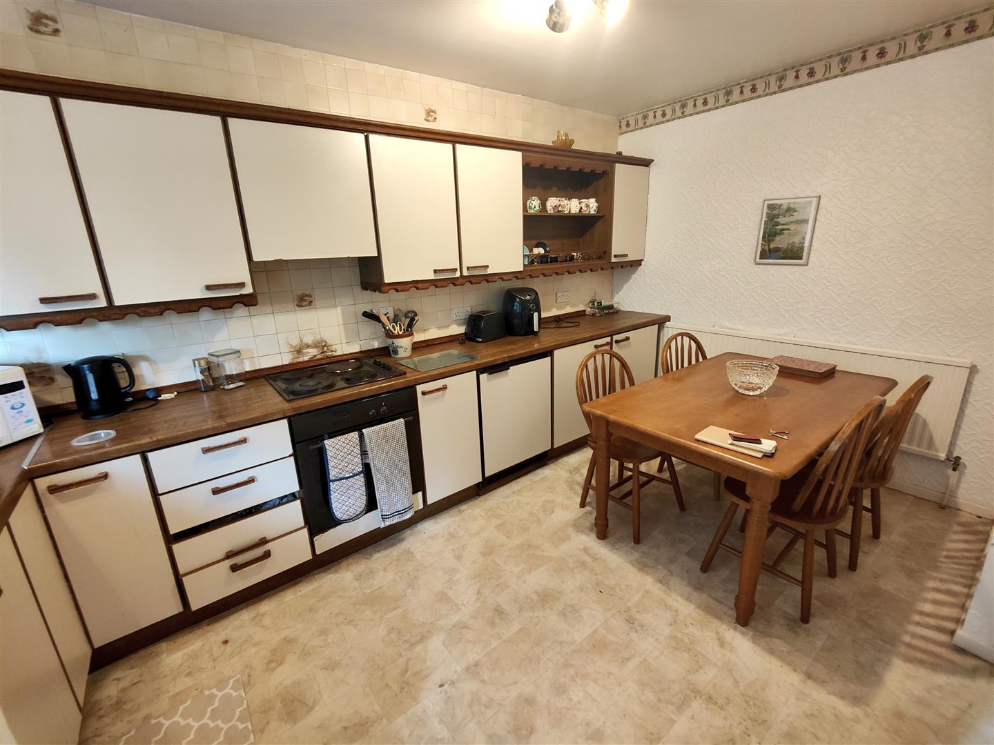 Bowl and 1/2 stainless steel sink unit, range of high and low level units, formica worktops, built-in under oven and gas hob, dishwasher space, panelled radiator, partly tiled walls, built-in storage cupboards.