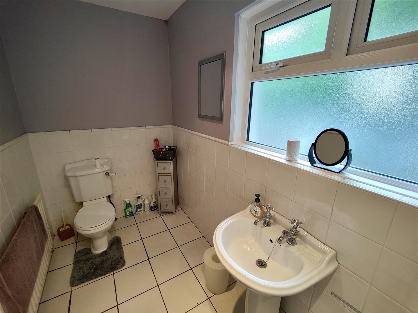 Matching suite with low flush wc, 1/2 tiled walls, ceramic tiled floor.
