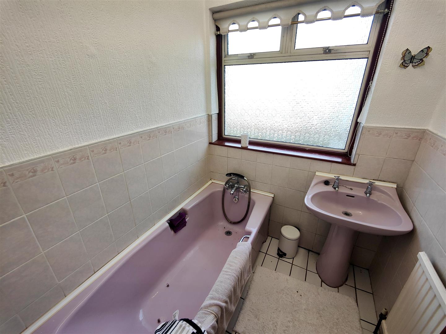 Coloured bathroom suite comprising panelled bath, pedestal wash hand basin, partly tiled walls, panelled radiator, ceramic tiled floor.