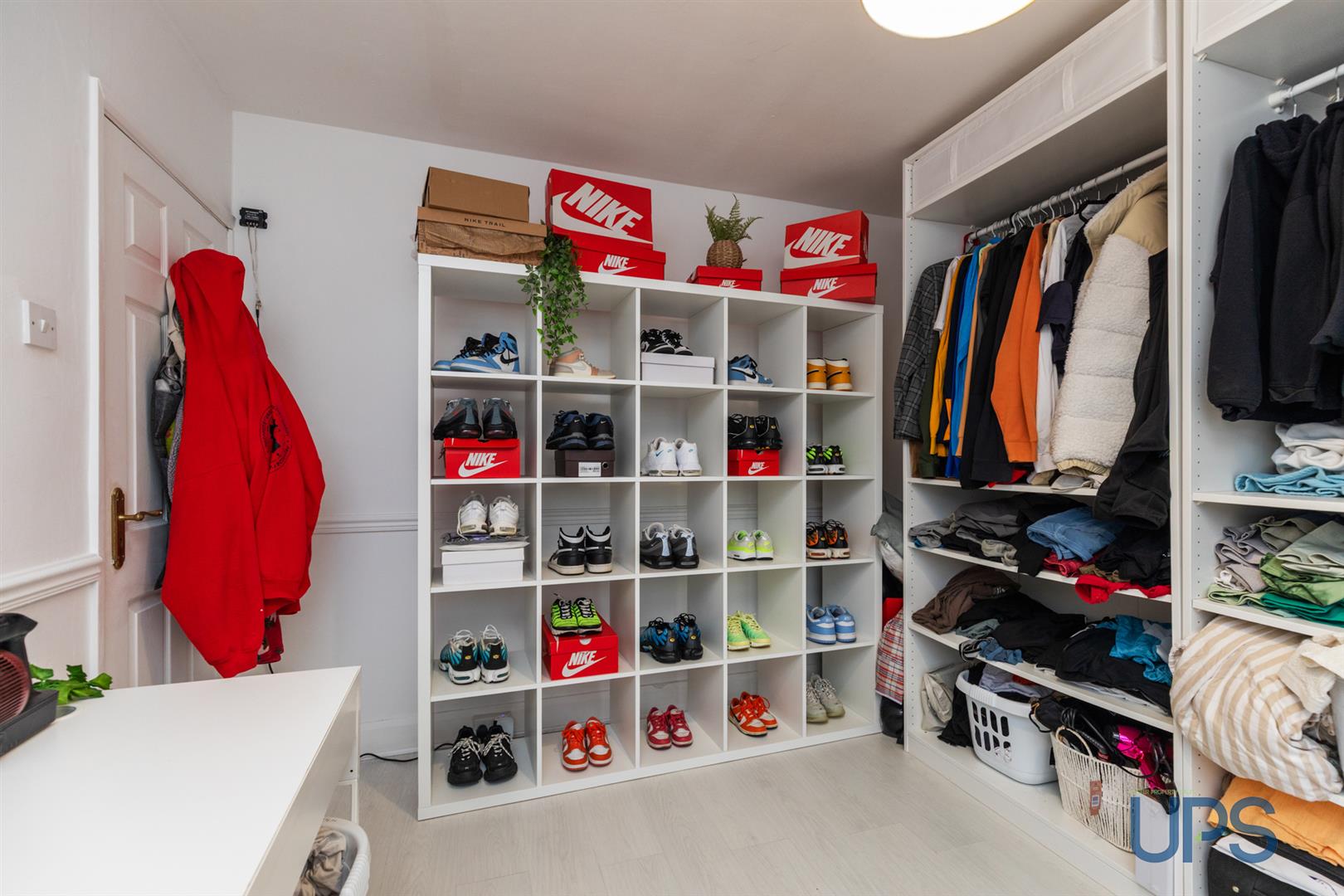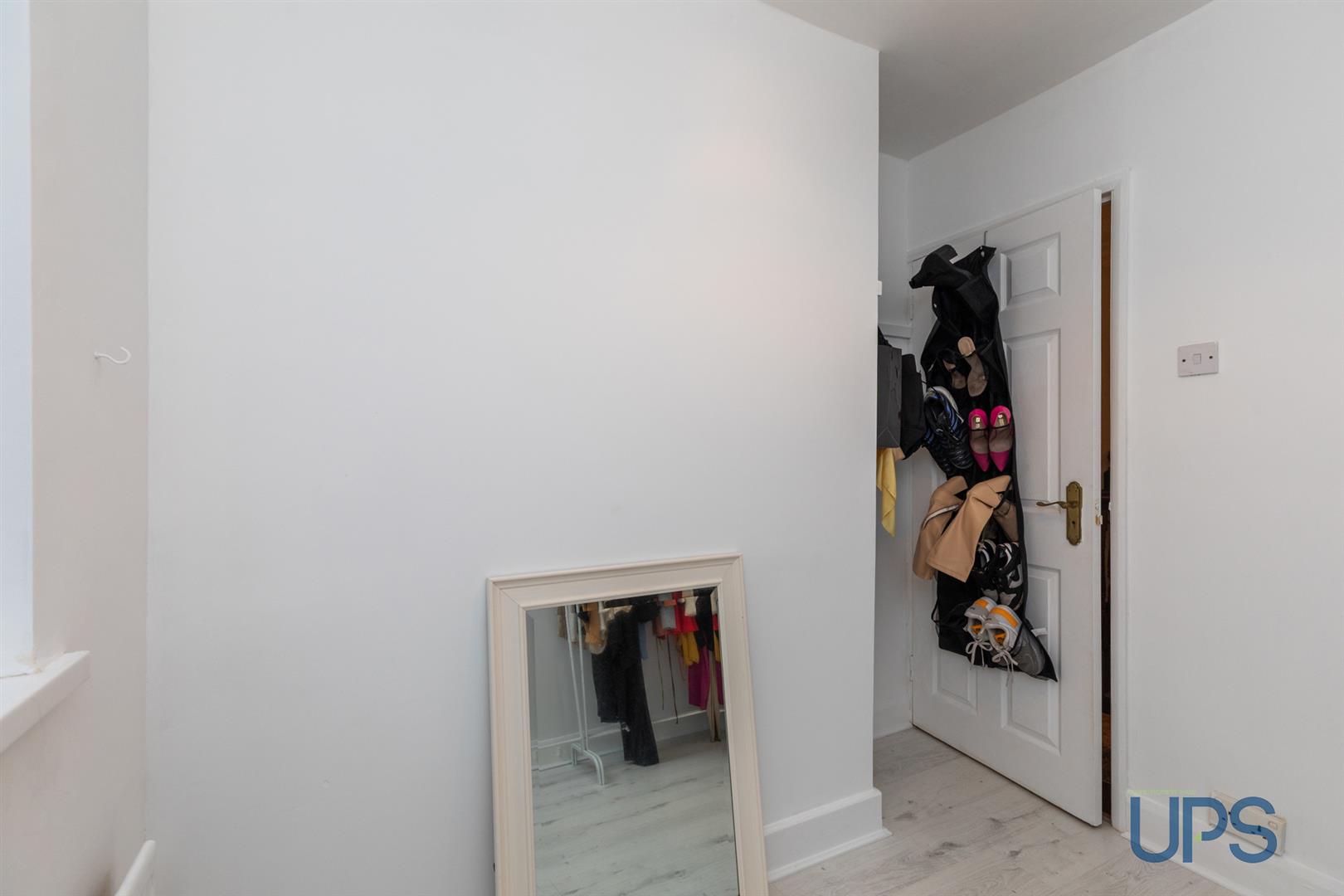 Wood laminate floor, panelled walls, panelled radiator, understairs storage.