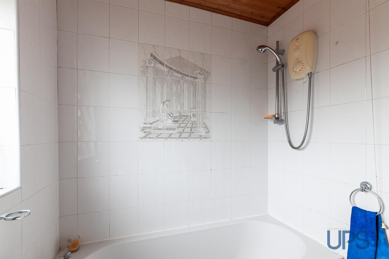 Bath, electric shower unit, low-flush w.c., pedestal wash hand basin, chrome effect towel warmer, chrome effect sanitary ware, tiled floor and walls.