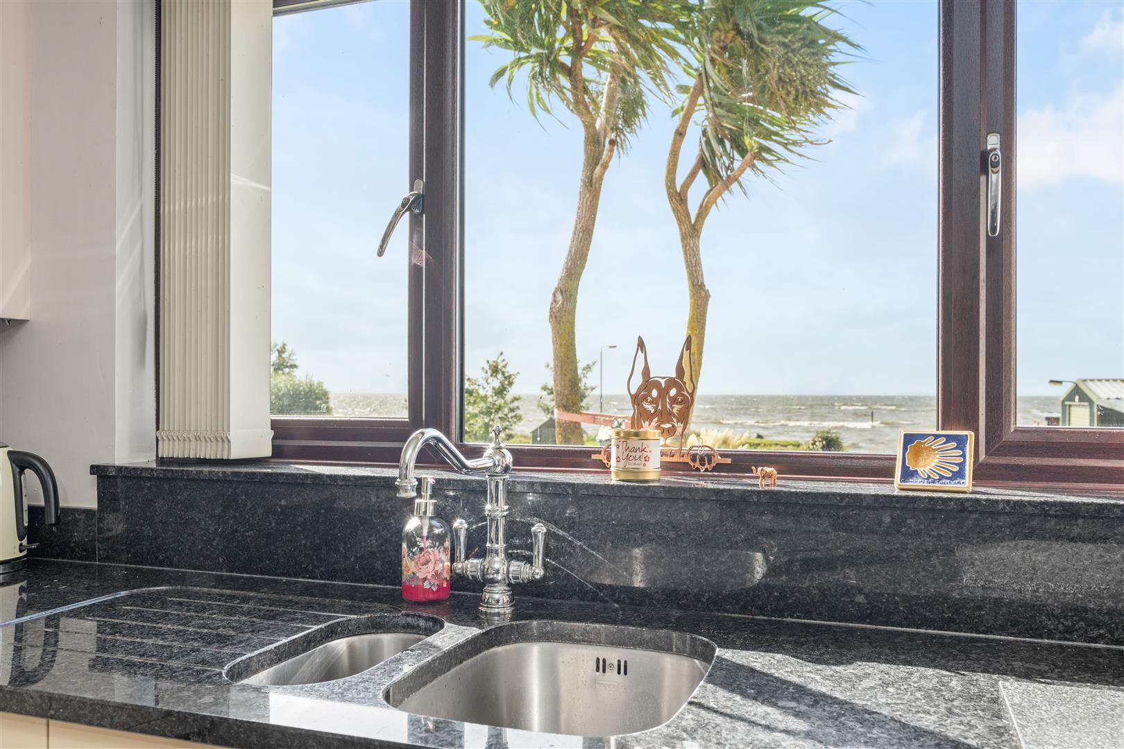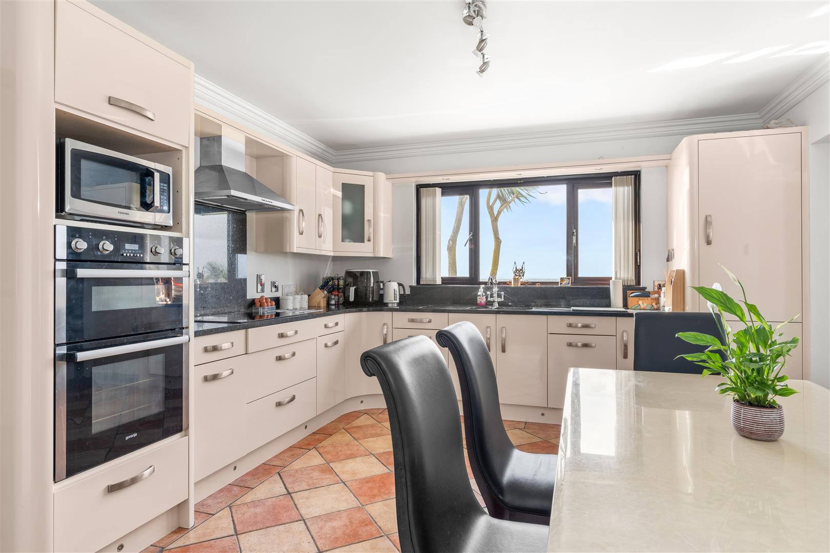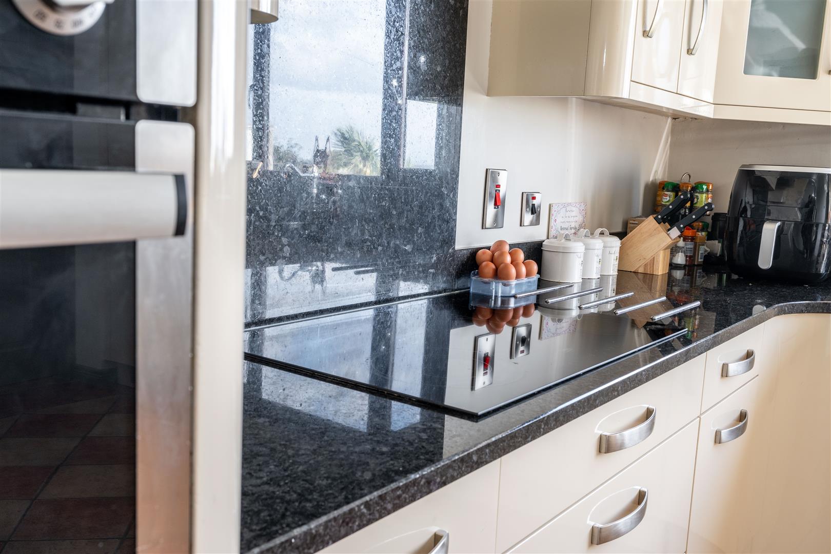 Fully fitted cream contemporary style high and low level kitchen units with contrasting polished granite worktops, upstands and short stainless steel handles. Integrated one and a quarter bowl stainless steel sink unit with chrome 'Victorian' style mixer tap. Display cabinets. Integrated appliances to include a five ring halogen hob with granite splashback and stainless steel pyramid style overhead extractor fan. Mid level double oven and grill. Bullet lights to the kickstand. Fully tiled floor. Double radiator. Arched opening to;