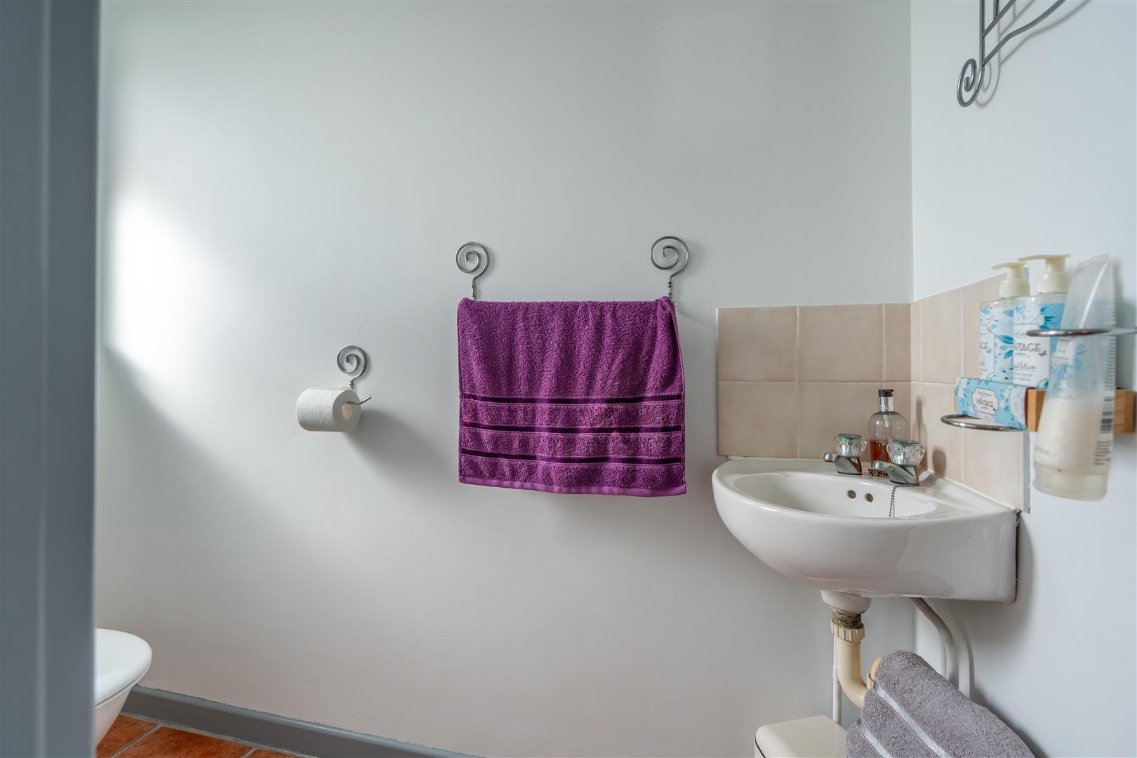 White suite comprising a low flush WC. Wash hand basin with stainless steel hot and cold taps and tiled splashback. Fully tiled floor.