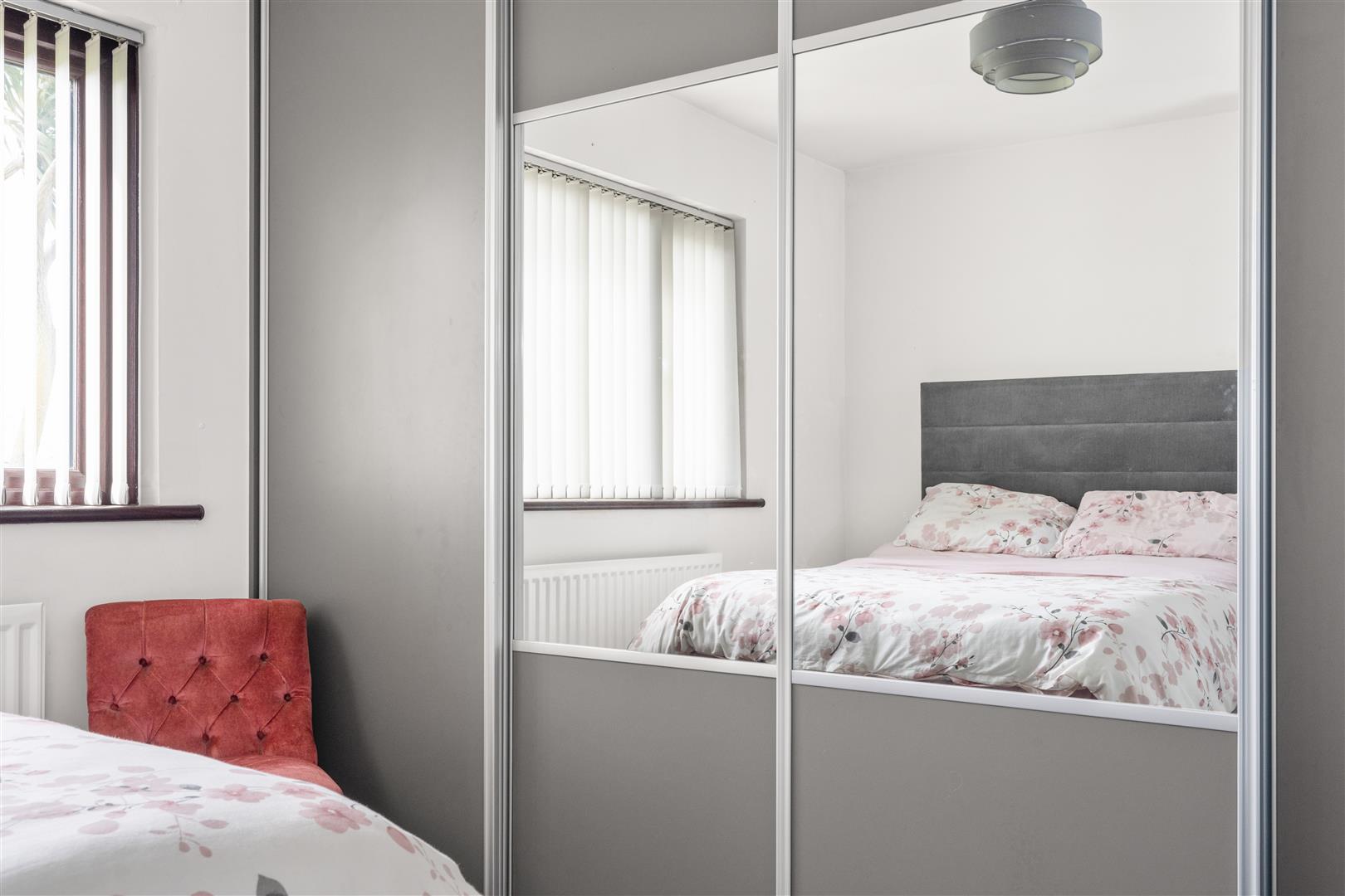 Integrated storage cupboard with sliding mirror doors, clothing rails and storage insets. Single radiator.