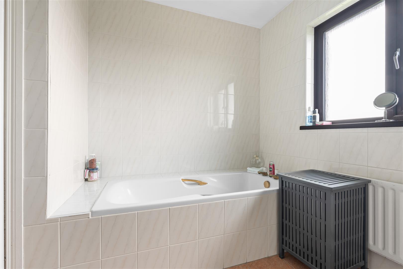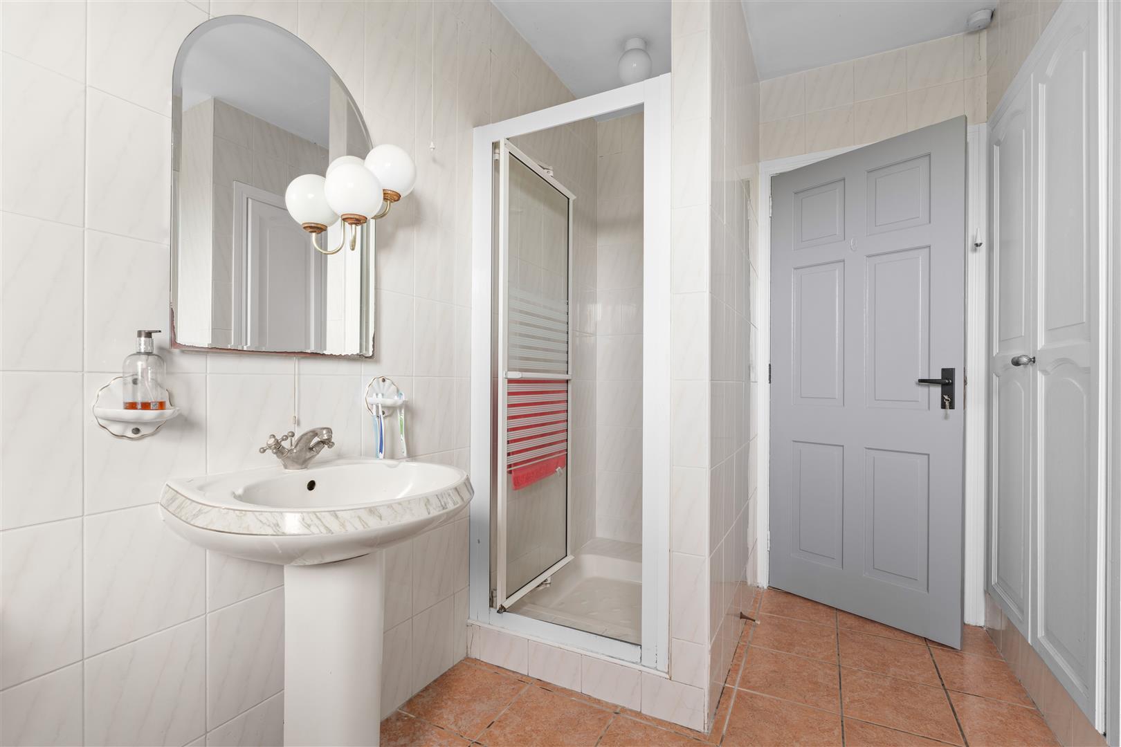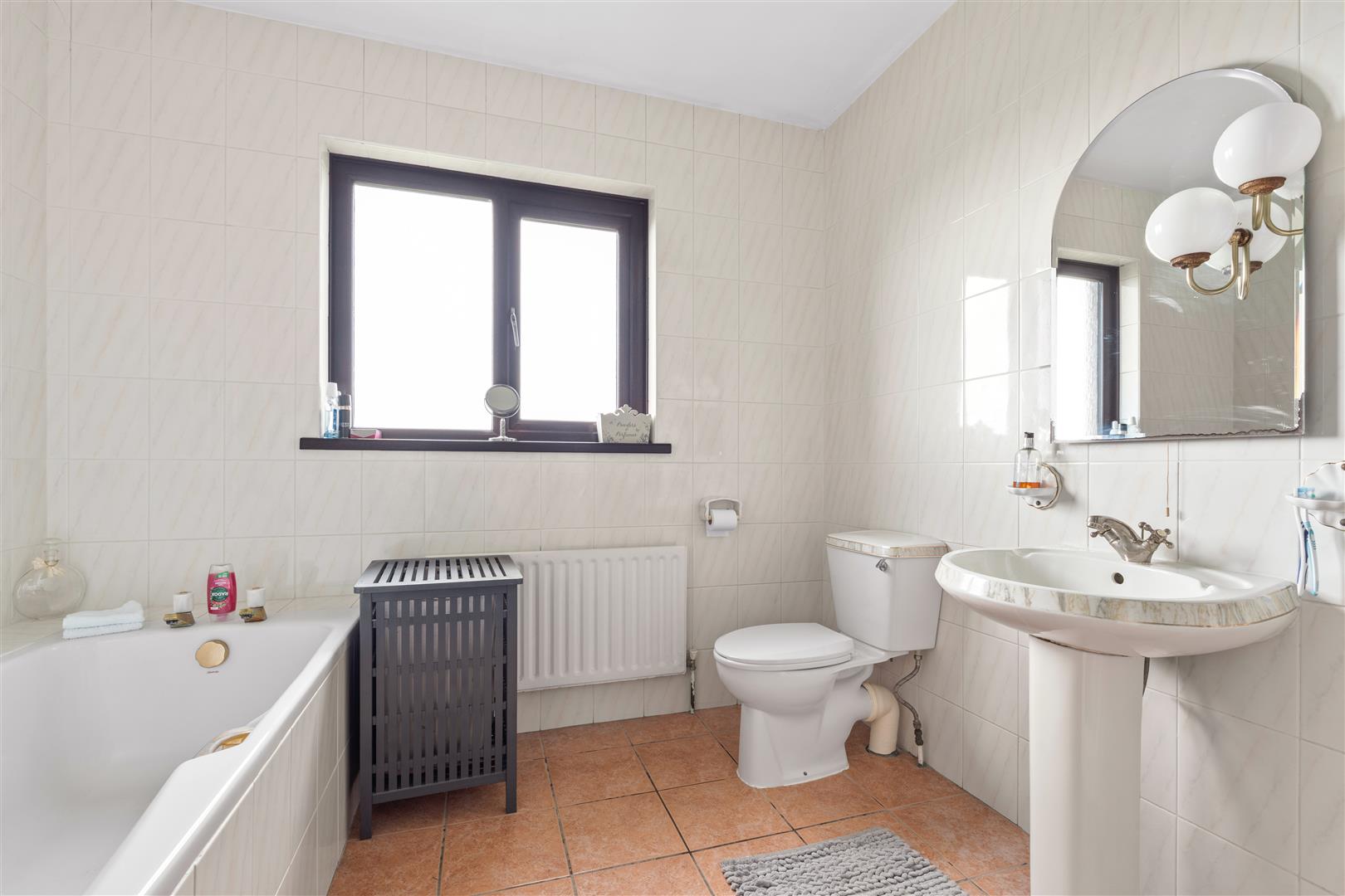 White suite comprising a tiled panel bath with gold effect hot and cold taps. Enclosed wall to wall shower with 'Redring expressions' electric shower and partially glazed door. Pedestal wash hand basin with stainless steel 'Victorian' style mixer tap. Low flush WC. Fully tiled floor and partially tiled walls. Hot press storage with insulated copper cylinder and shelving. Single radiator.