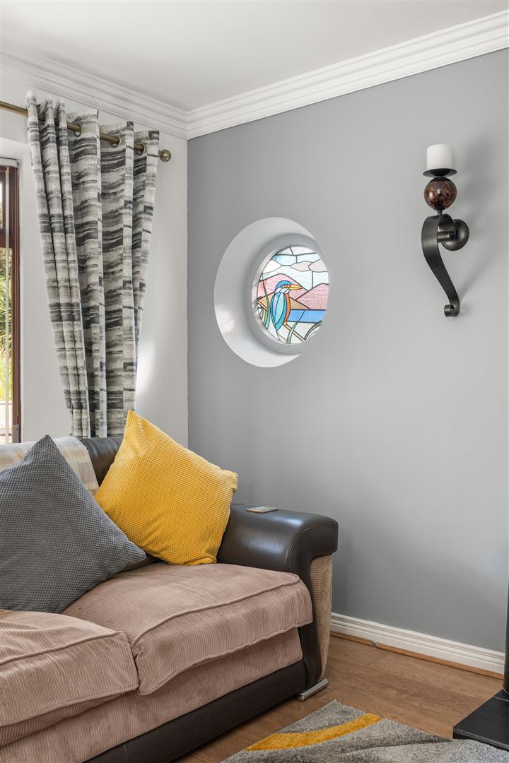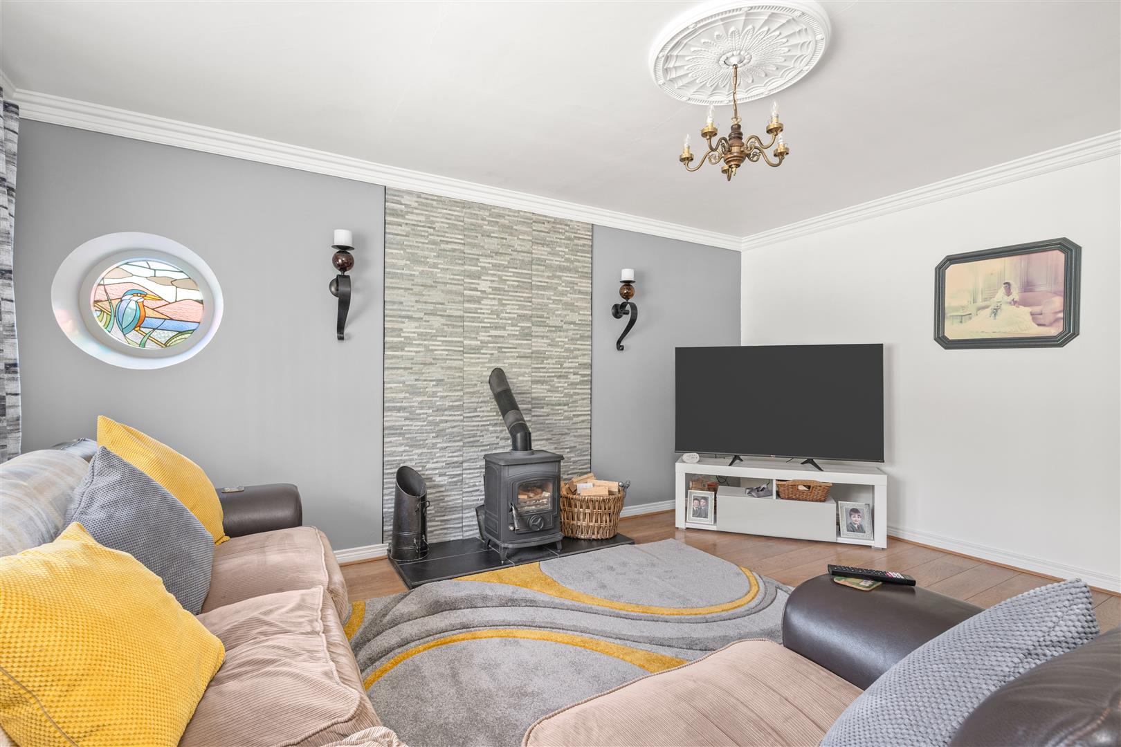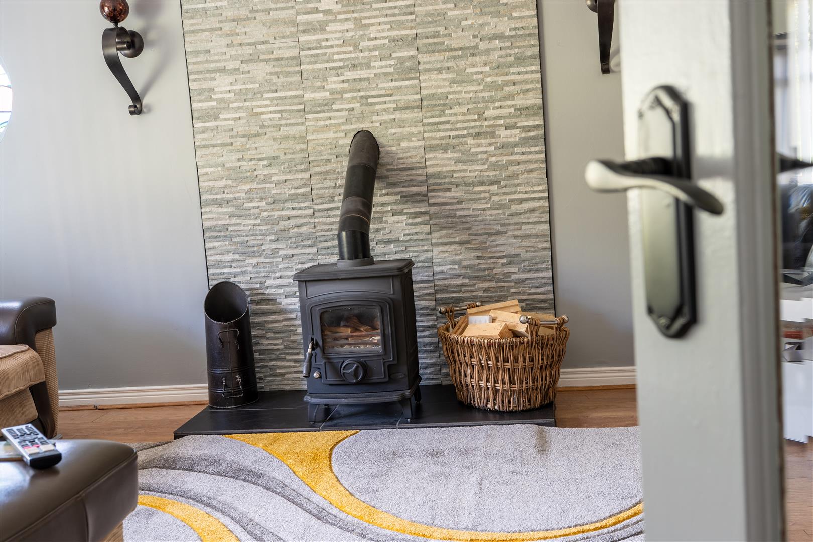 (into bay). Feature free standing wood burning stove with polished granite hearth and slate effect tiled splashback. Wood laminae flooring. Double radiator.