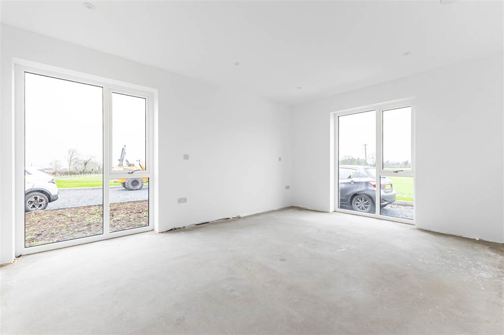 A spacious living room with wood burning stove, large floor to ceiling window with panoramic views over Lough Neagh, buyers choice of floor finish.