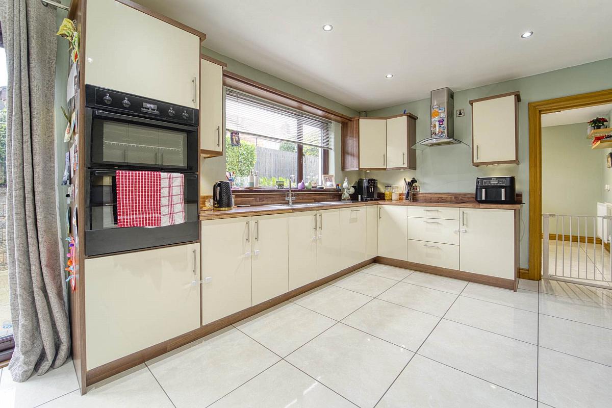 Range of high and low level units. Large and small bowl stainless steel sink unit. 4 ring ceramic hob, built-in double oven and stainless steel chimney hood. Integrated fridge/freezer. Integrated dishwasher. Downlighters. Tiled floor. PVC patio doors.
