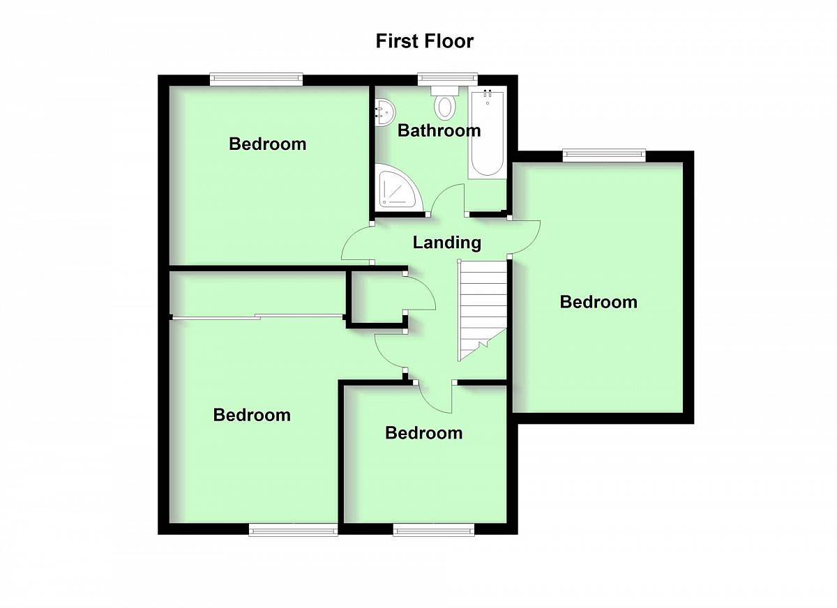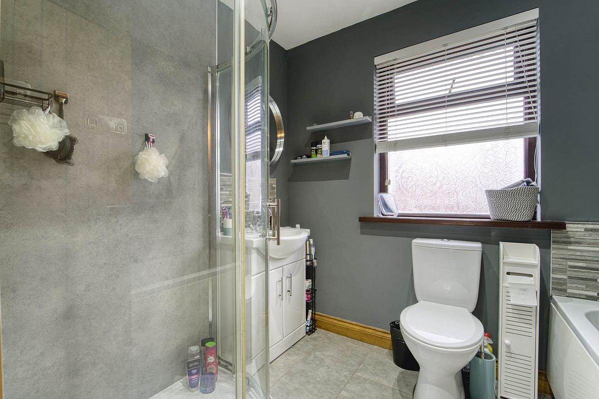 White suite to include bath, wash hand basin, w.c. and corner shower. Heated towel rail. Part panelled walls. Part tiled walls. Tiled floor.