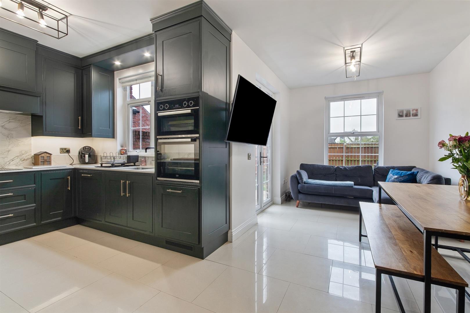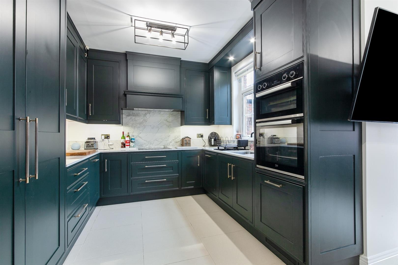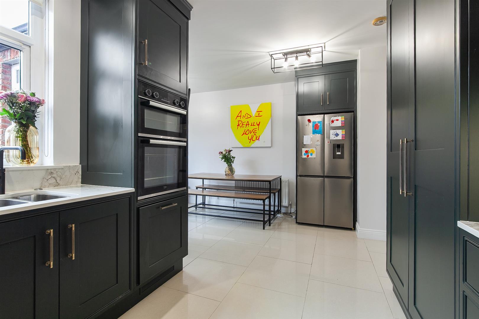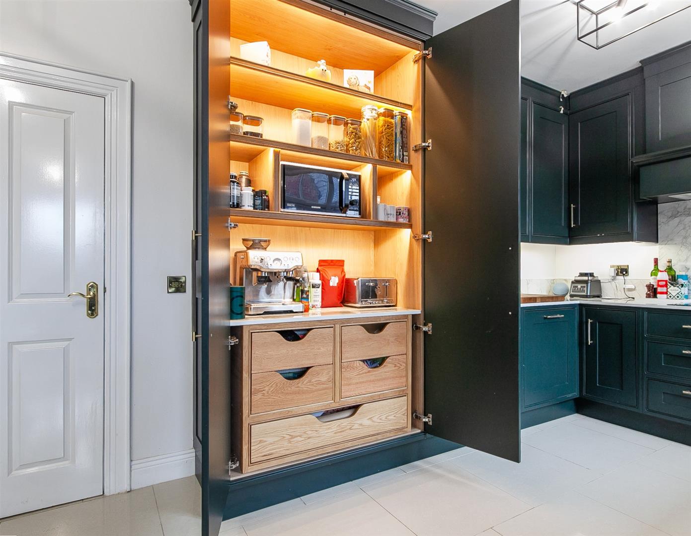 Luxury fitted bespoke in frame kitchen with comprehensive range of high and low level storage units with contrasting solid quartz worktop. Matching upstands to walls and splashback to hob area. Inlaid stainless steel 1.5 bowl sink unit. Quooker boiling water tap. Waste disposal unit. Integrated touch screen induction hob with extractor hood over. Space for American style fridge freezer. Integrated double ovens and integrated dishwasher. Tiled floor. Open arch leading to: