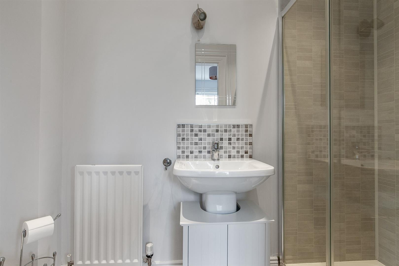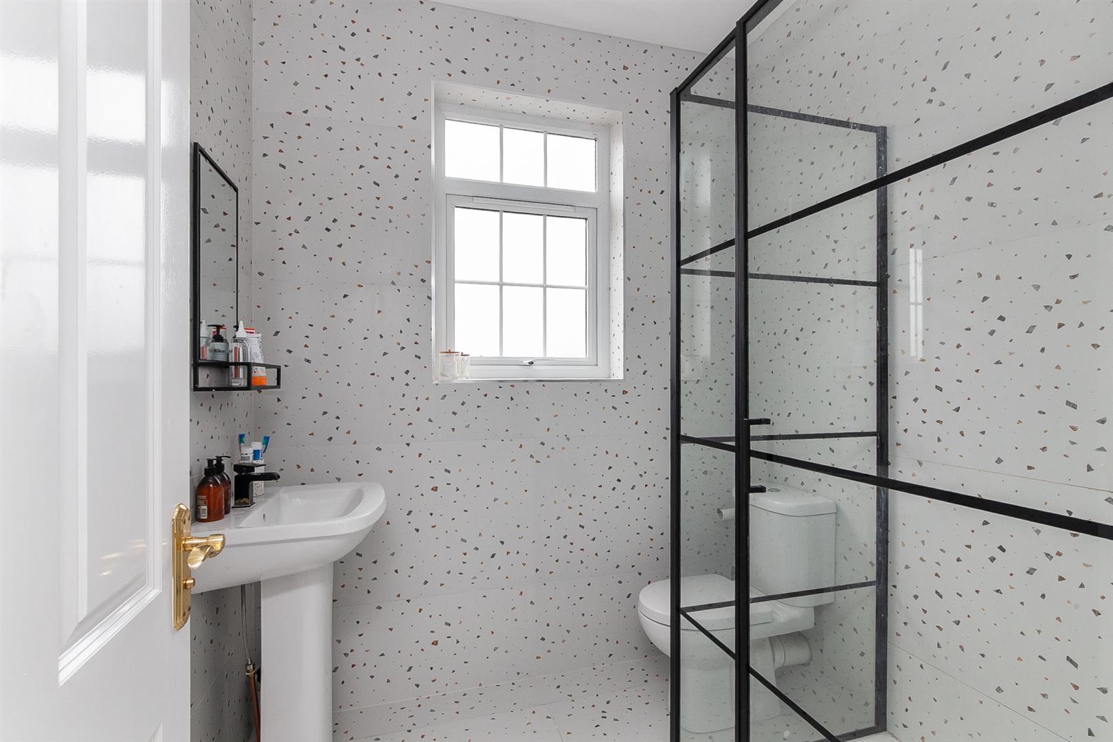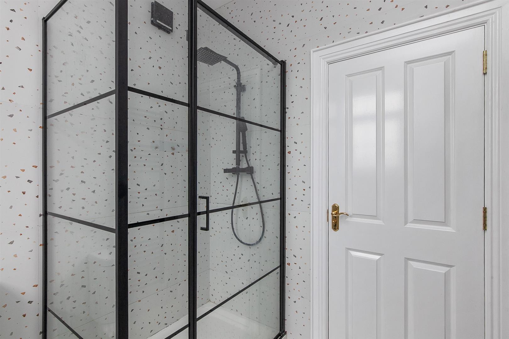 Contemporary, white, three piece suite comprising oversized shower enclosure, pedestal wash hand basin and WC. Thermostat controlled mains shower unit with drench shower head. Towel radiator.