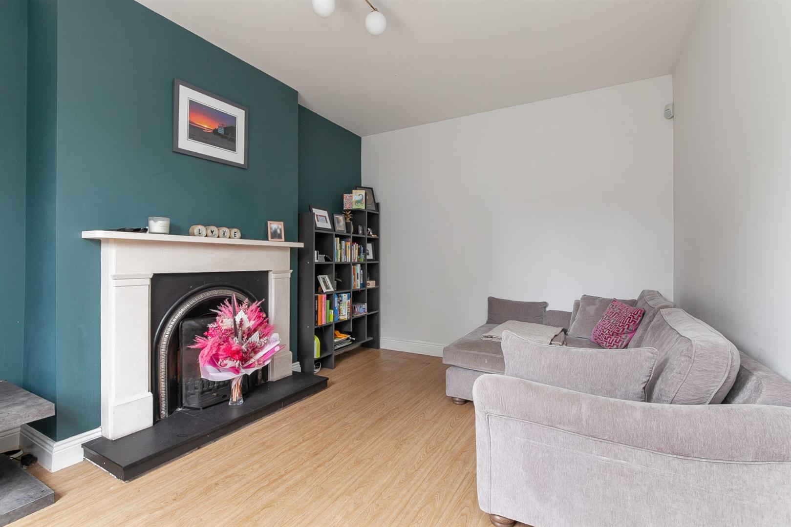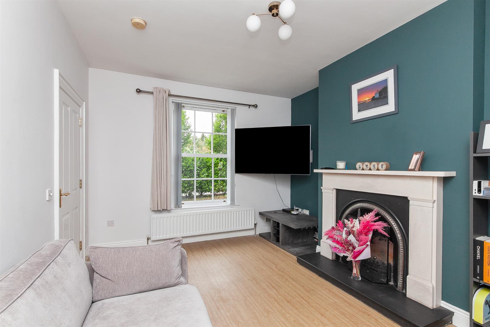 Open fire in cast iron fireplace with slate hearth with contrasting limestone surround. Picture window to front elevation.