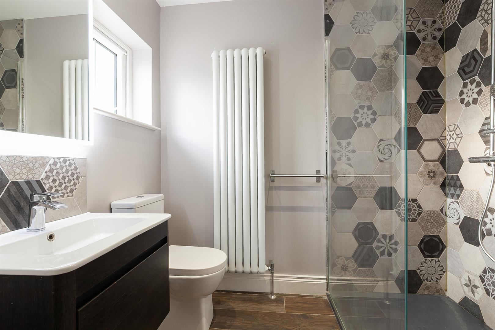 Contemporary, white, three piece suite comprising oversized fully tiled shower enclosure, floating vanity unit and WC. Thermostat controlled mains shower with drench shower head. Splashback tiling and illuminated mirror over sink. Tiled floor.