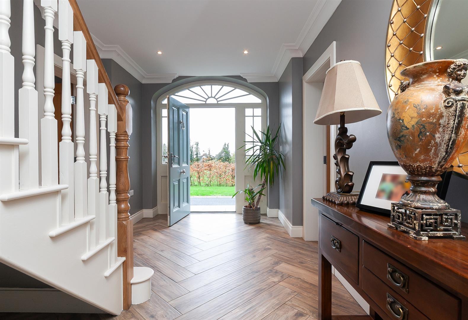 Hardwood, Georgian style front door with matching side screens and fan light over. Tiled floor. Stairwell to first floor gallery landing. Access to cloakroom. Coving to ceiling, continuing throughout remainder of home.