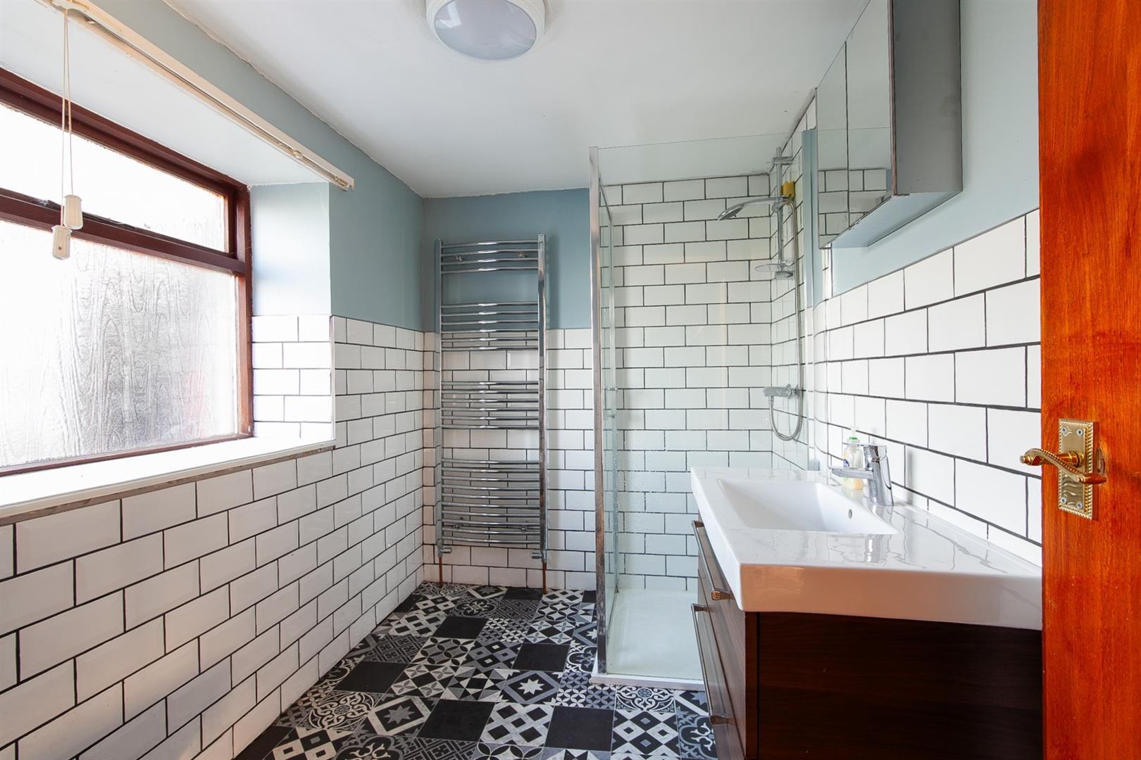 Three piece suite comprising panelled bath, vanity unit and WC. Access to shelved hot press. Fully tiled walls.